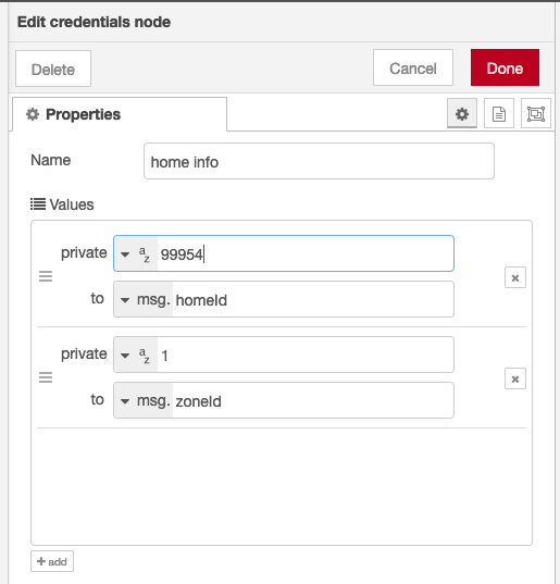 Trigger the log home info flow. If you only have one home and one zone, then you can get the homeId and zoneId to use from looking at the node status as shown below. If you however have multiple homes or multiple zones, you should check the debug log to determine which information you want to use.