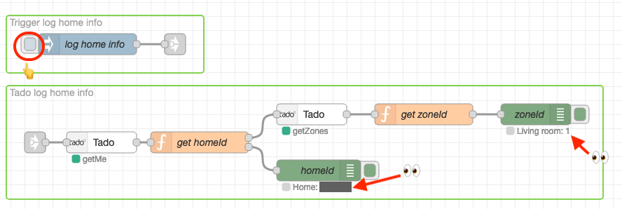The next thing we should do is to get the homeId and zoneId to use for our data import. To make these values easy to find, we provide a helper flow (in green) that you can run to extract the relevant information.