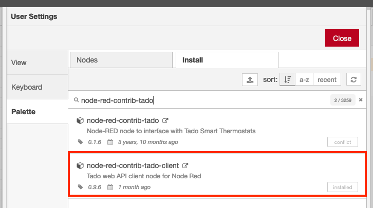 Be sure to install node-red-contrib-tado-client and not the conflicting node-red-contrib-tado.