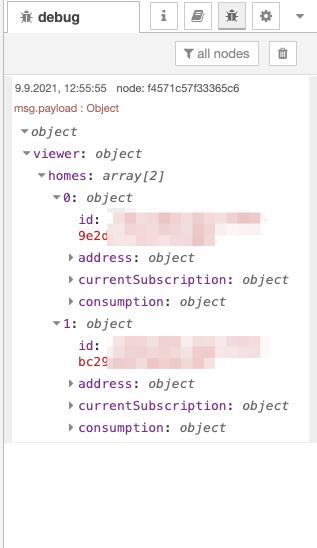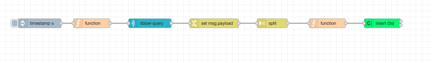 Once the nodes are installed, we will need to combine inject, function, tibber-query and a debug node. Connect the nodes as shown in the example below