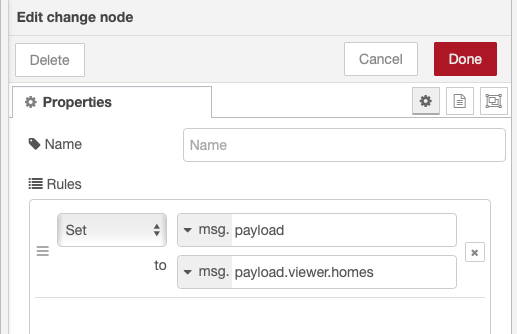 First we will need to map the content of msg.payload.viewer.homes into msg.payload, to do so, place a change block after the tibber-query node and configure it as shown in the screenshot.