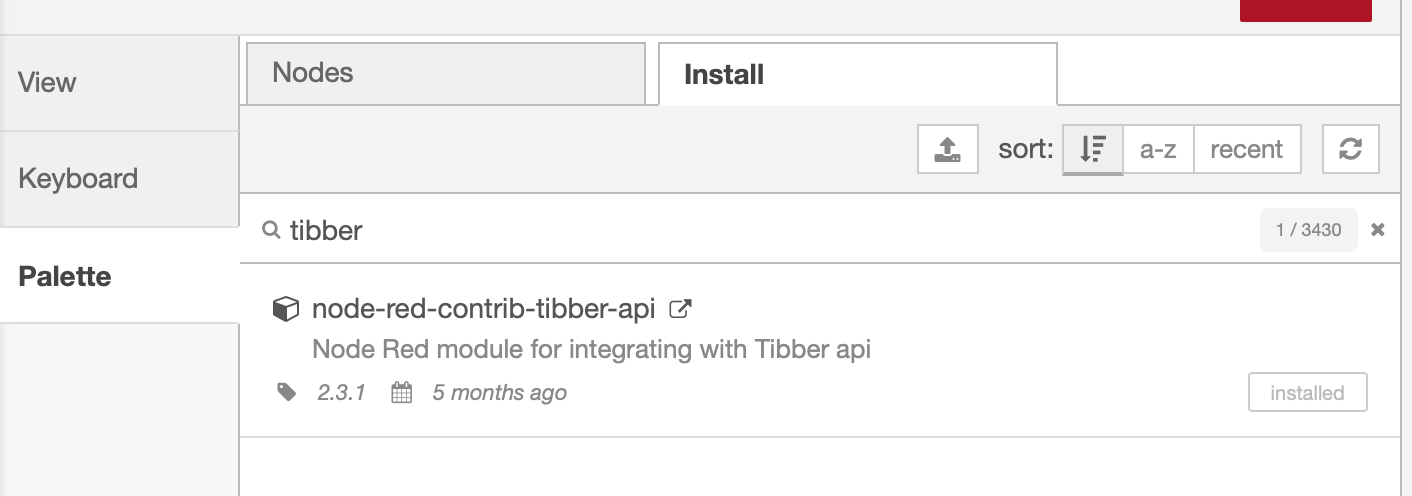 Open the palette and search for node-red-contrib-tibber-api installing this will give us the nodes we need to communicate with Tibber.