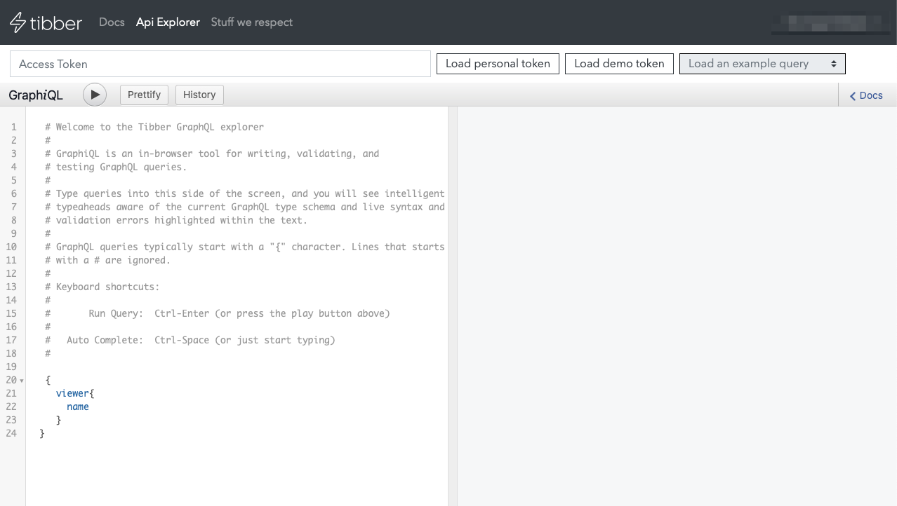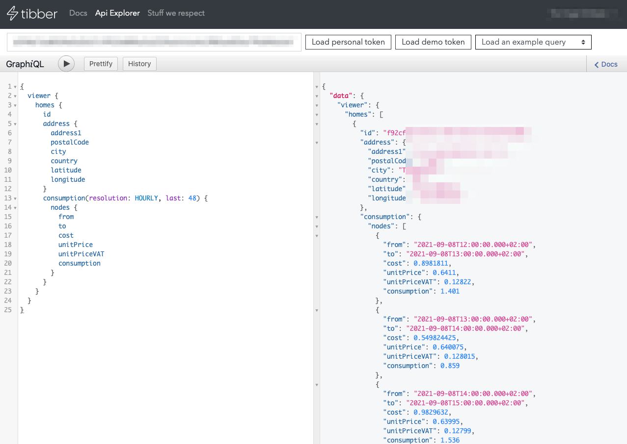 Tibber uses a GraphQL API and we can use their developer page to create a query that will return the data we need. To do so, head on over to their developer portal sign in and open the API Explorer.