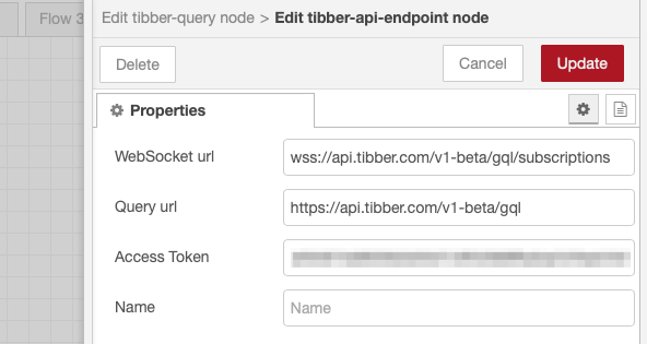 The next step is to open the tibber-query node and configuring the API Endpoint. Leave the URLs as they are, then copy the access token from the Tibber Developer page into the "Access Token" field and press "Update".