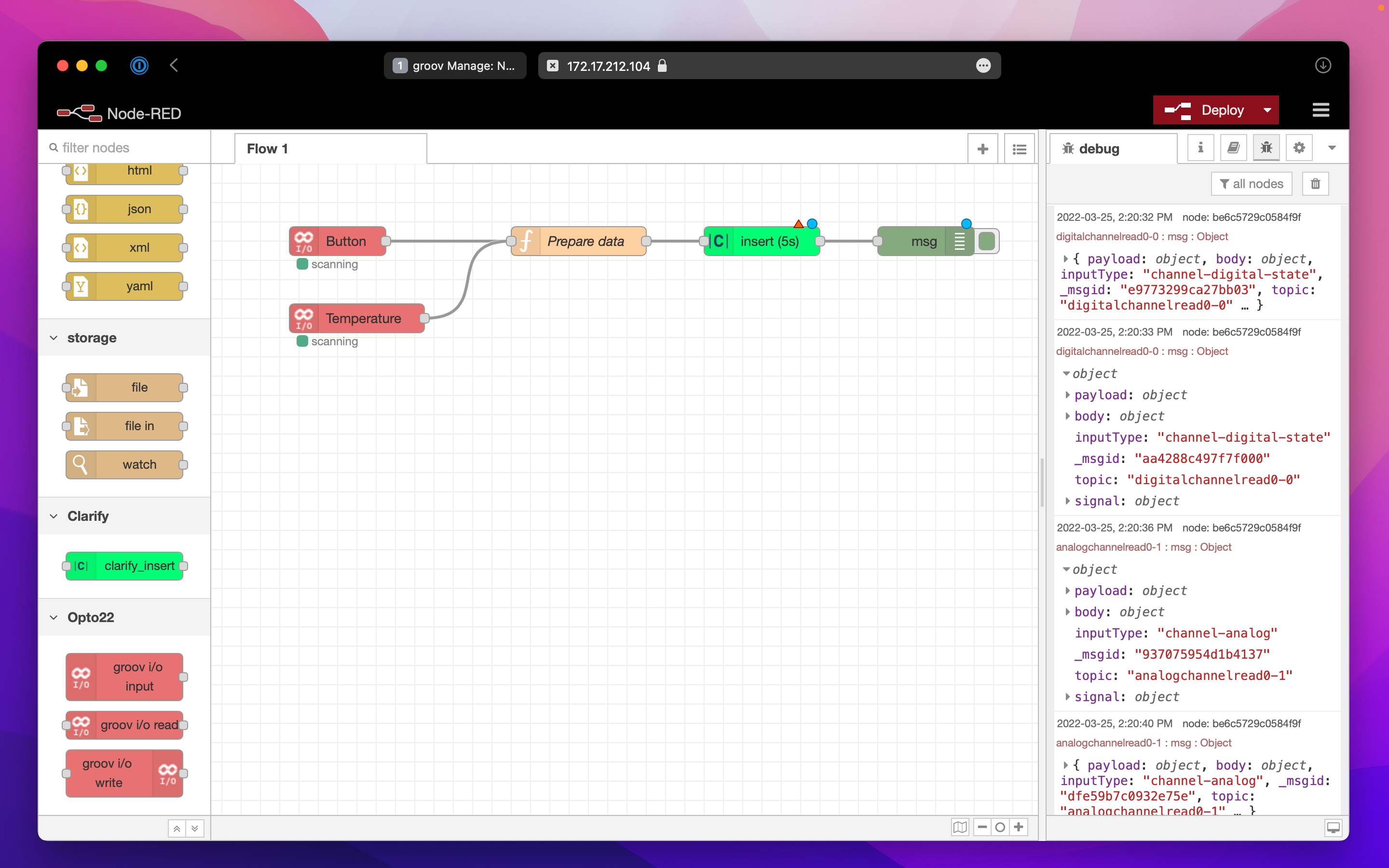 In this guide we're going to show you how to connect your Opto22 Rio Groov device to Clarify, using the built-in support for Node-RED. By doing so, you will be able to visualize your data and share it with your colleagues.