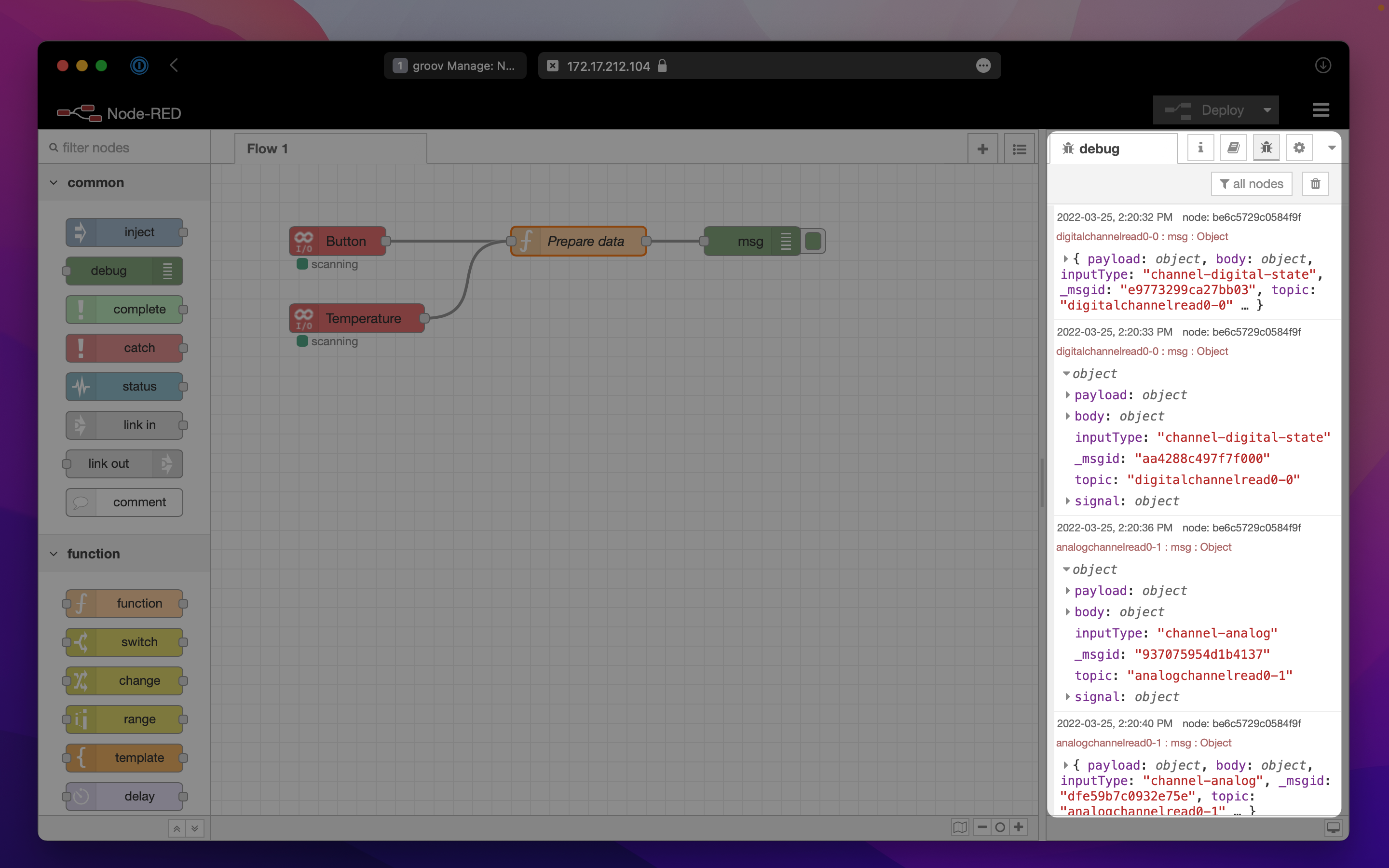 Reading data from the I/O channels in Node-RED is done with the groov-io-input node. Drag an input node and a debug node into an empty flow and connect them, like shown in the video.