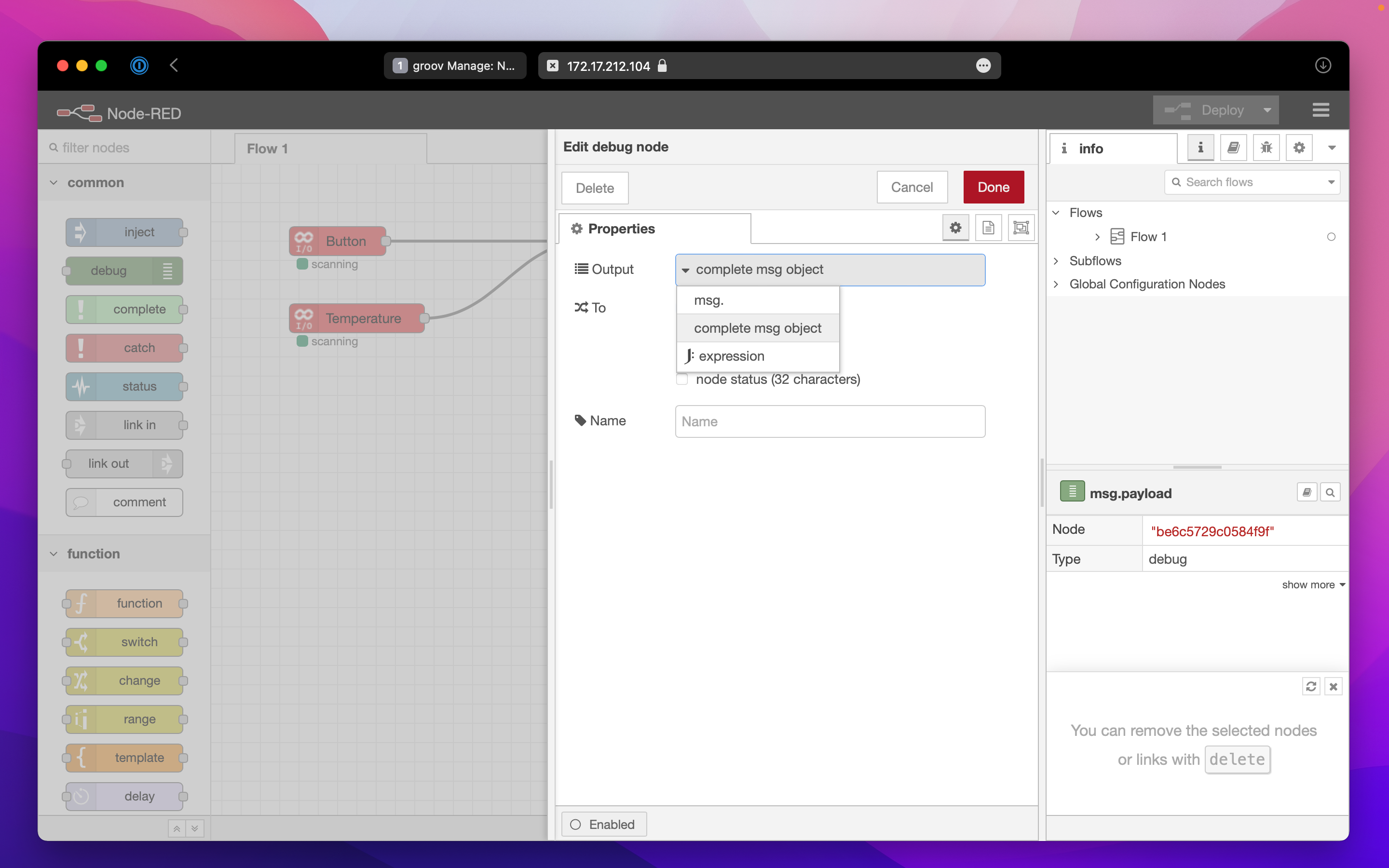 In order to see if things are working, let's open the debug panel and see what is being logged. To get a full view of the contents of the data, we need to configure the debug node to show us the whole message and not just the payload, so double click the debug node and select "complete msg object" for the Output type.