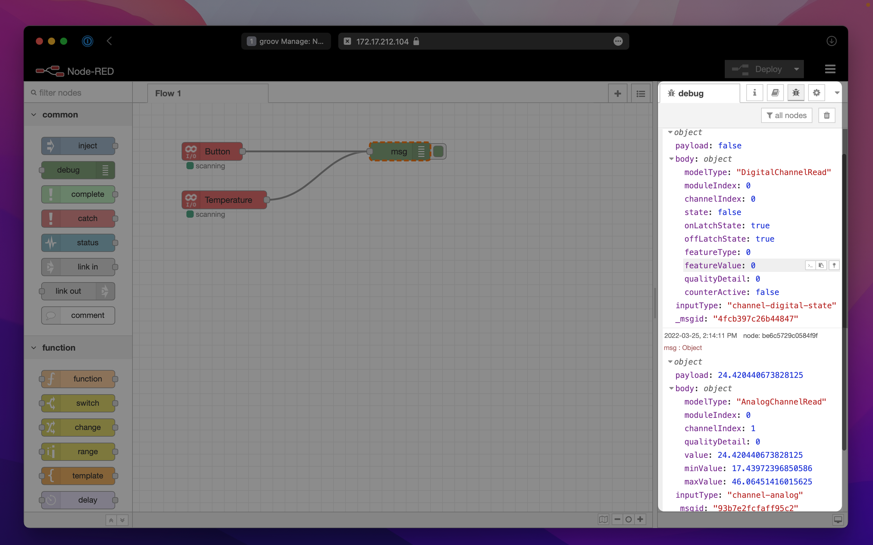 The rest of our setup will depend on the hardware we have connected to the device. In our example we have a button connected to M0C0 (Module Index 0, Channel Index 0) and a temperature sensor connected to M0C1. The video below shows how to configure an input node for both and connecting them to the debug output.
