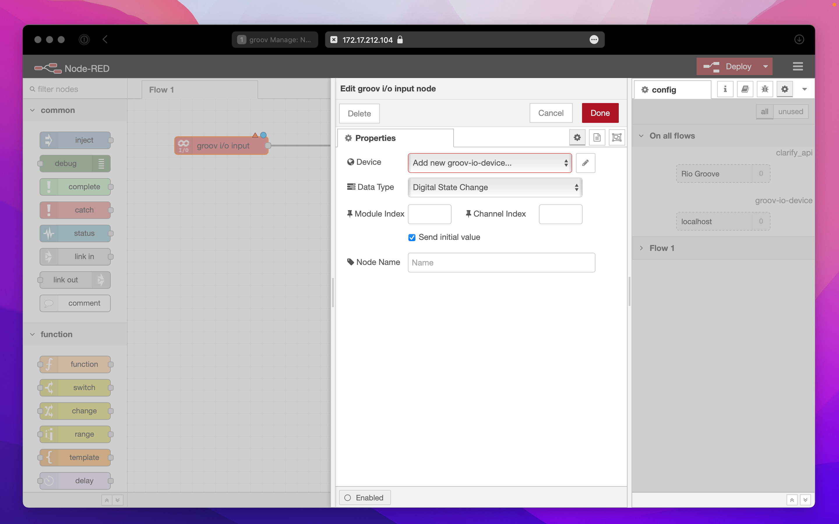 If this is your first time using Node-RED on the device, you likely need to install the groov-io-input node. To do so, follow the instructions provided here.