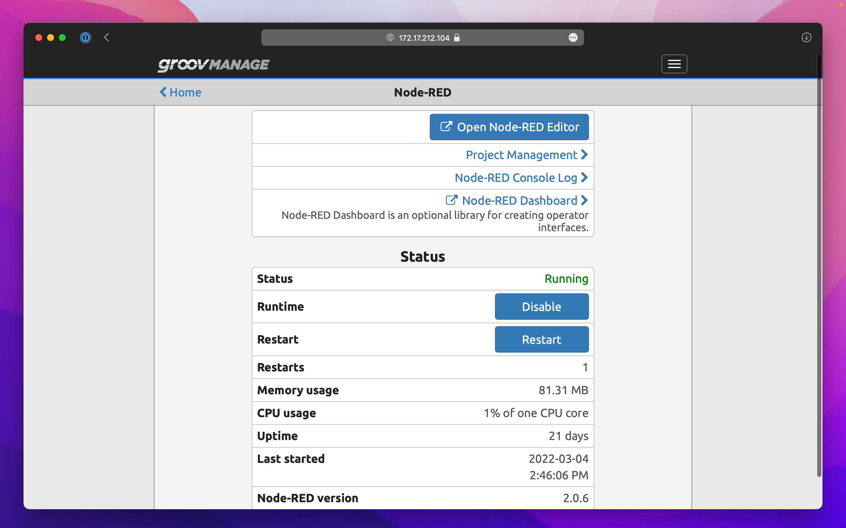 Finally we need to enable the Node-RED runtime, which we do from system settings.