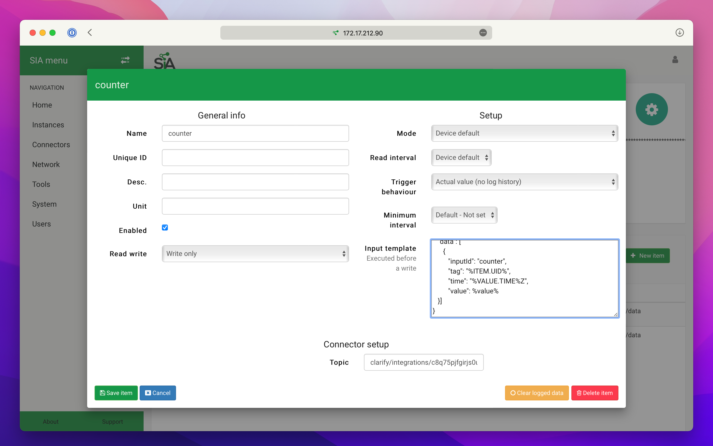 The concept in SIA is that we create an item on each of the instances, and a mapping between them. Using the mappings, we can do things like only writing data when certain conditions are met, or formatting the data differently. Since we already have an item created for the OPC UA instance, let's begin by creating another item in the Clarify instance where we will write the data.