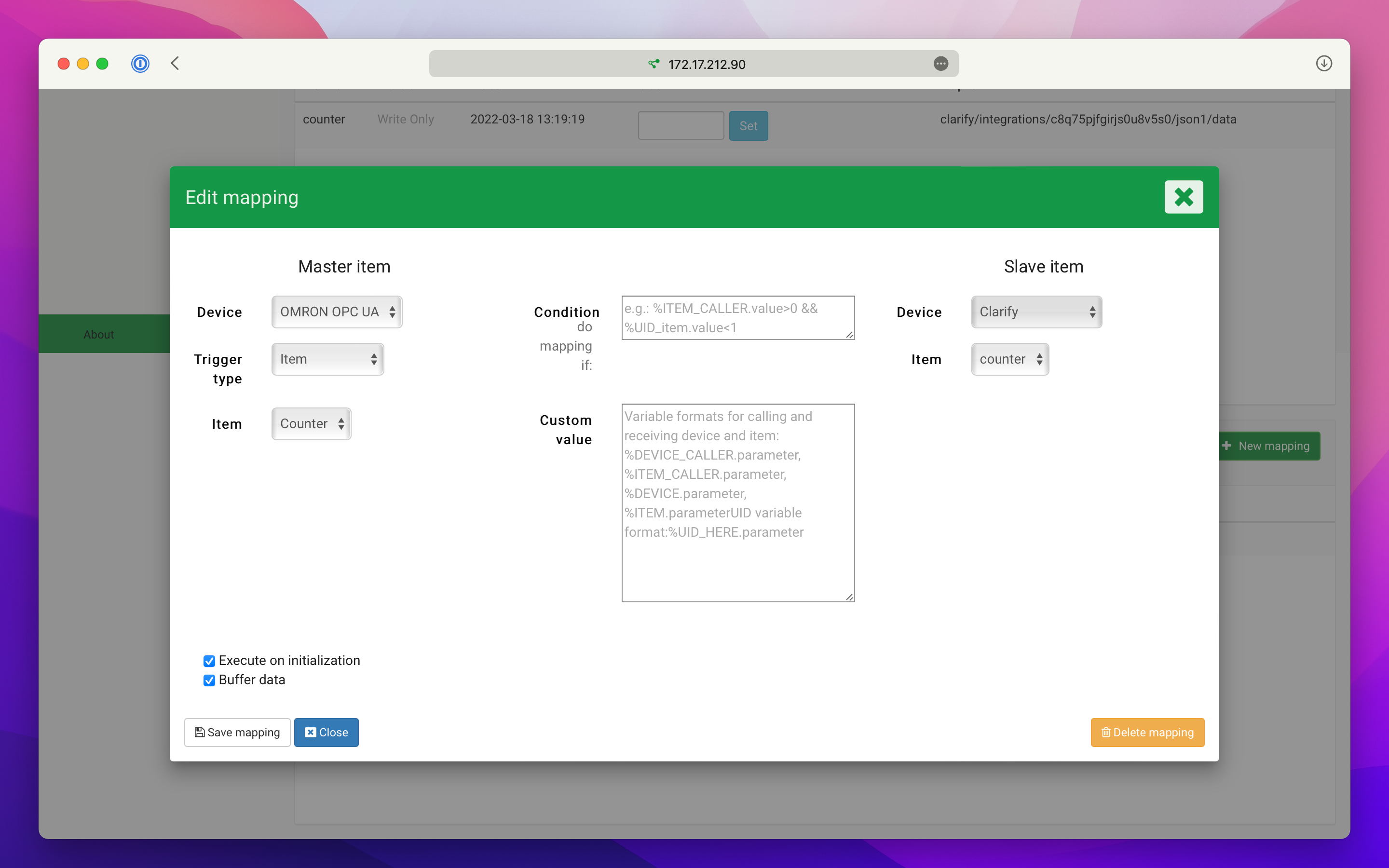 Next we need to create a mapping to connect the OPC UA item, and the MQTT item. While inside the Clarify MQTT instance, create a new mapping with these settings: