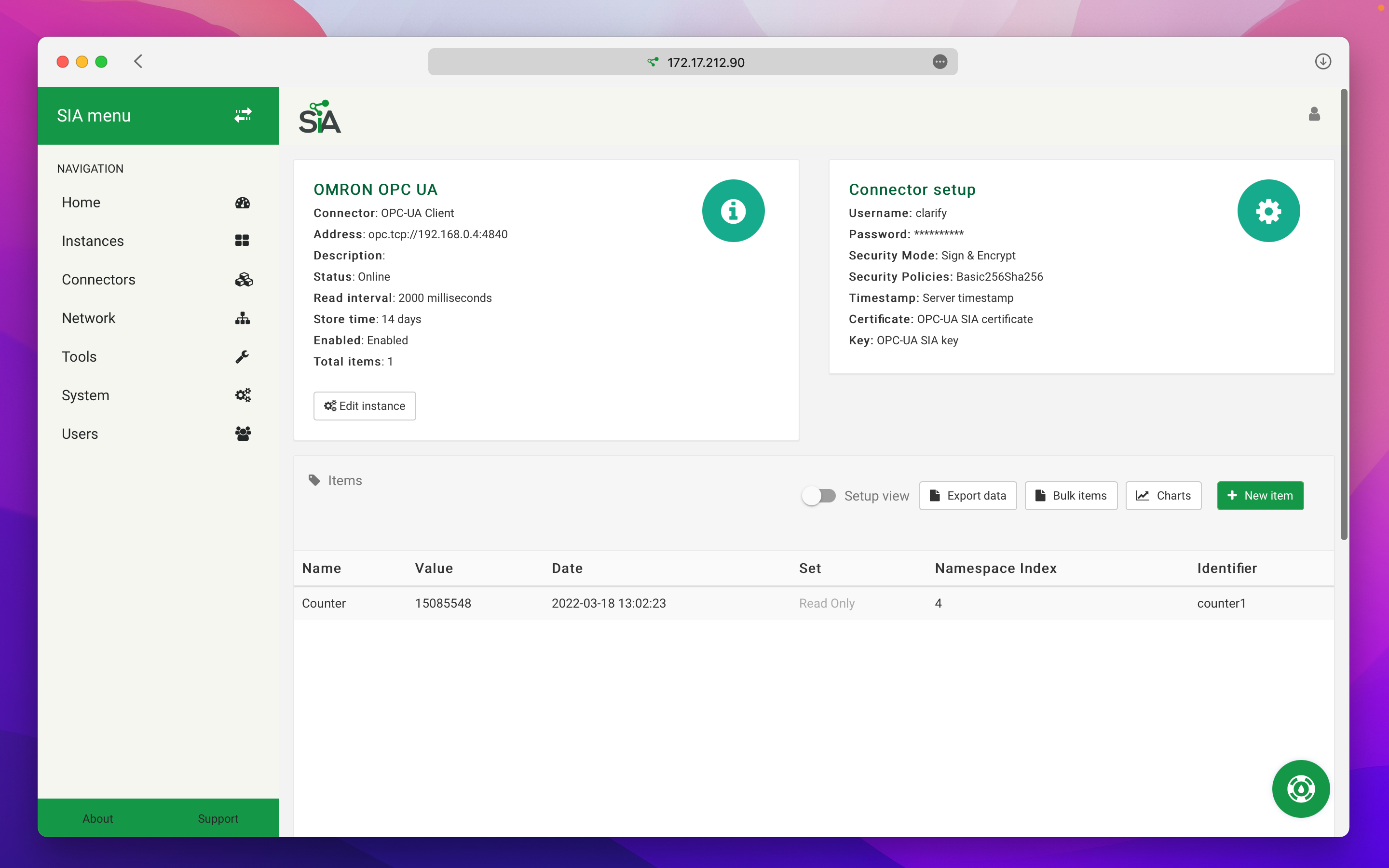 Now we need some data to send to Clarify to test if the connection works. You can use whatever you want, but in this example we've set up an OPCUA connection to an Omron device. For a detailed overview of using the OPCUA module in SIA, we recommend you check out their documentation.
