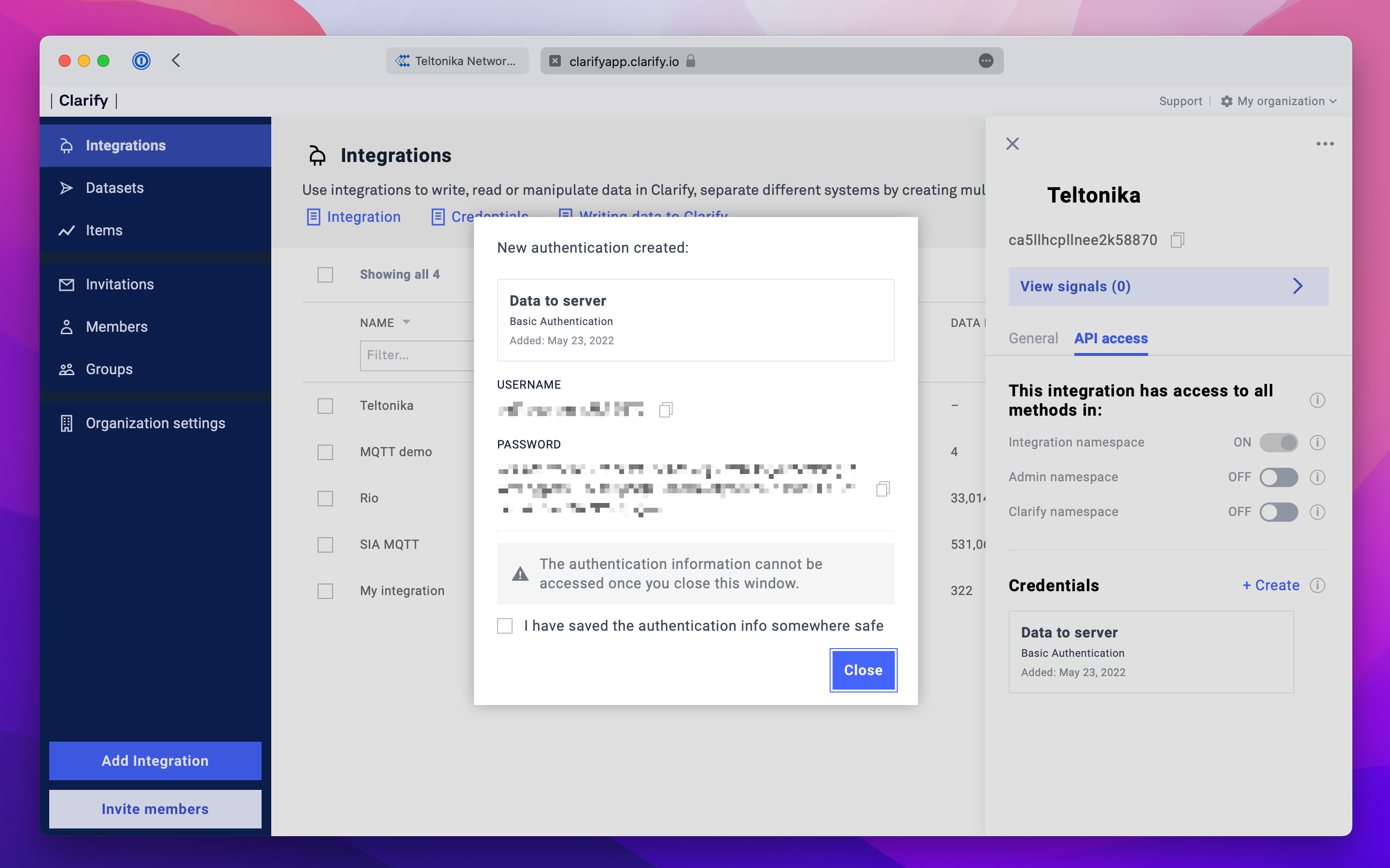 With the Modbus setup working we are going to connect the device to Clarify in order to store and visualize the data. Before we proceed with this step, we are going to need an integration in Clarify to send the data to. If you haven't already created one, follow the steps shown in integrations to create an integration and a set of Basic Auth credentials.