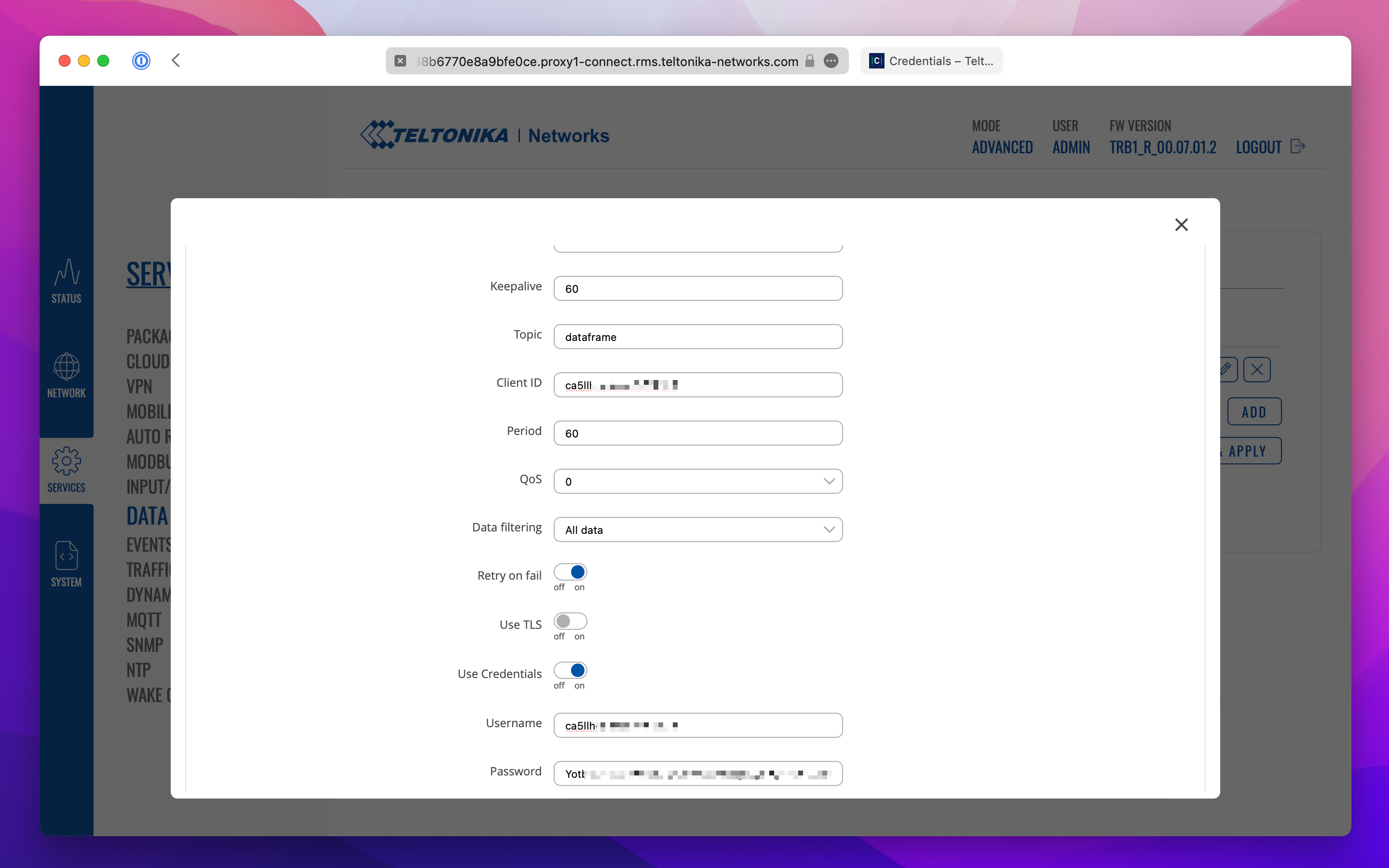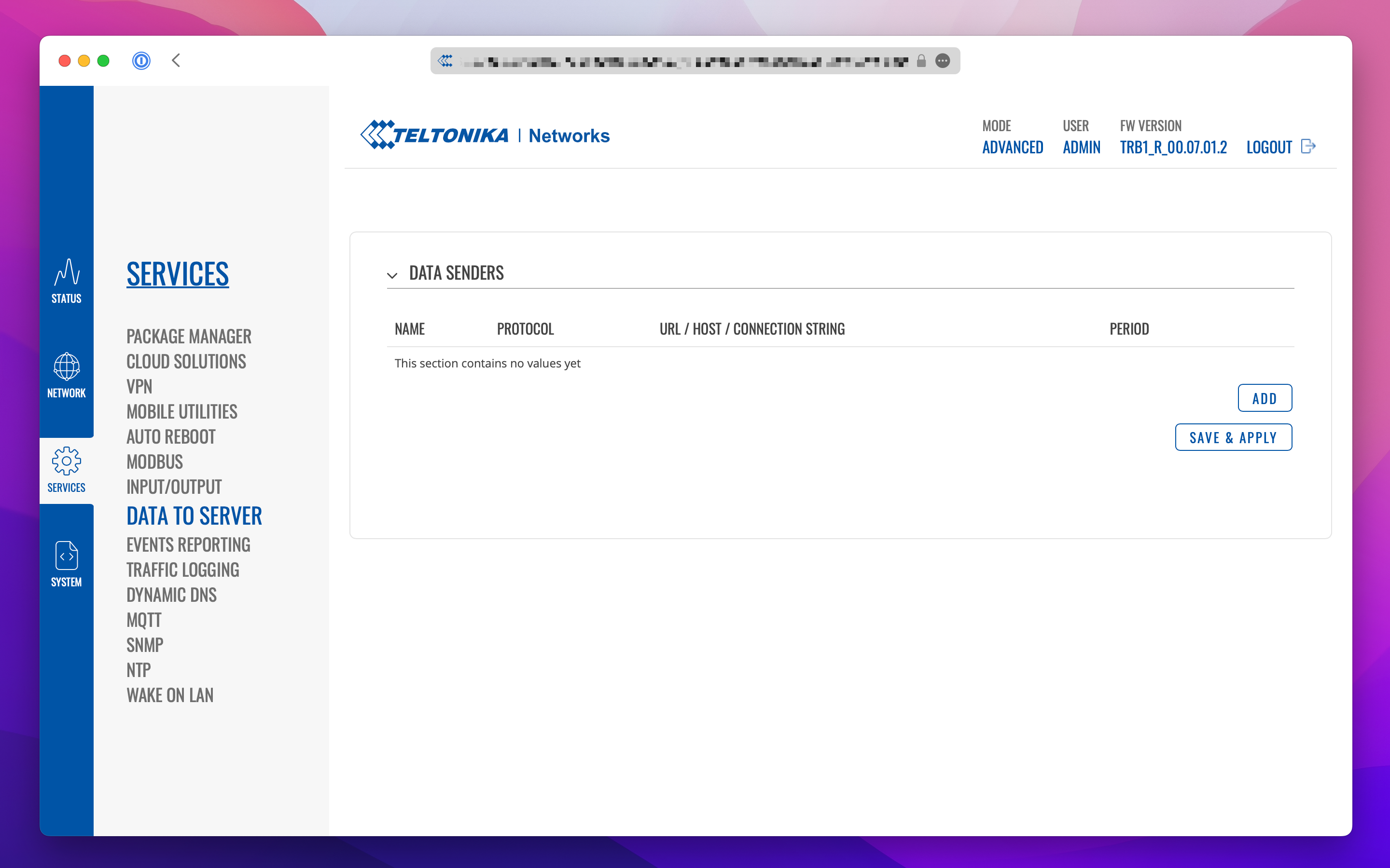 Now that we have an integration and credentials for it, we can use the Data to server function of the Teltonika device. Navigate to Services>Data to server and select Add to begin configuring a new connection.