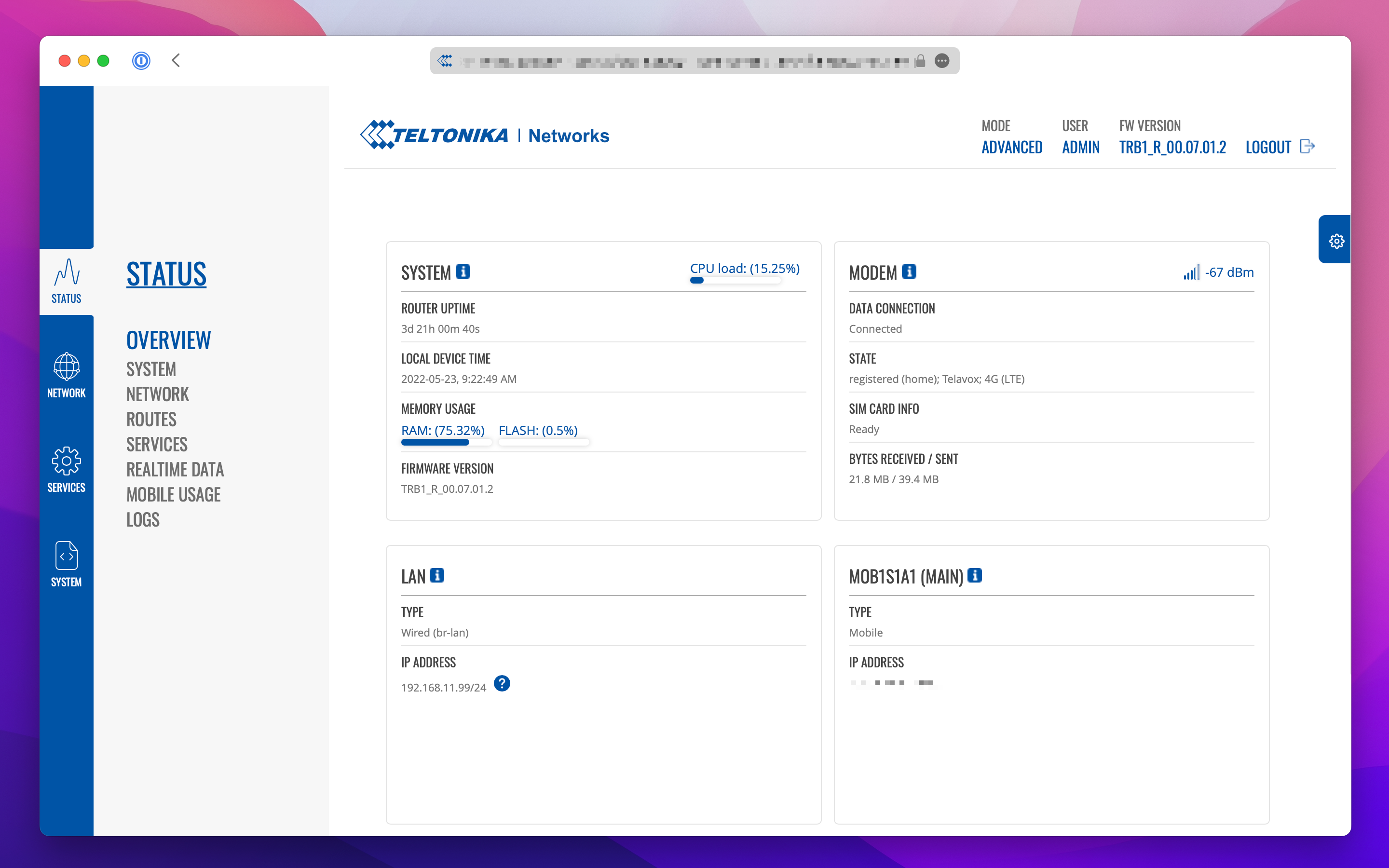 To get started we are going to start by opening a browser and typing in the address of our Teltonika device. You should now be looking at the interface show below.