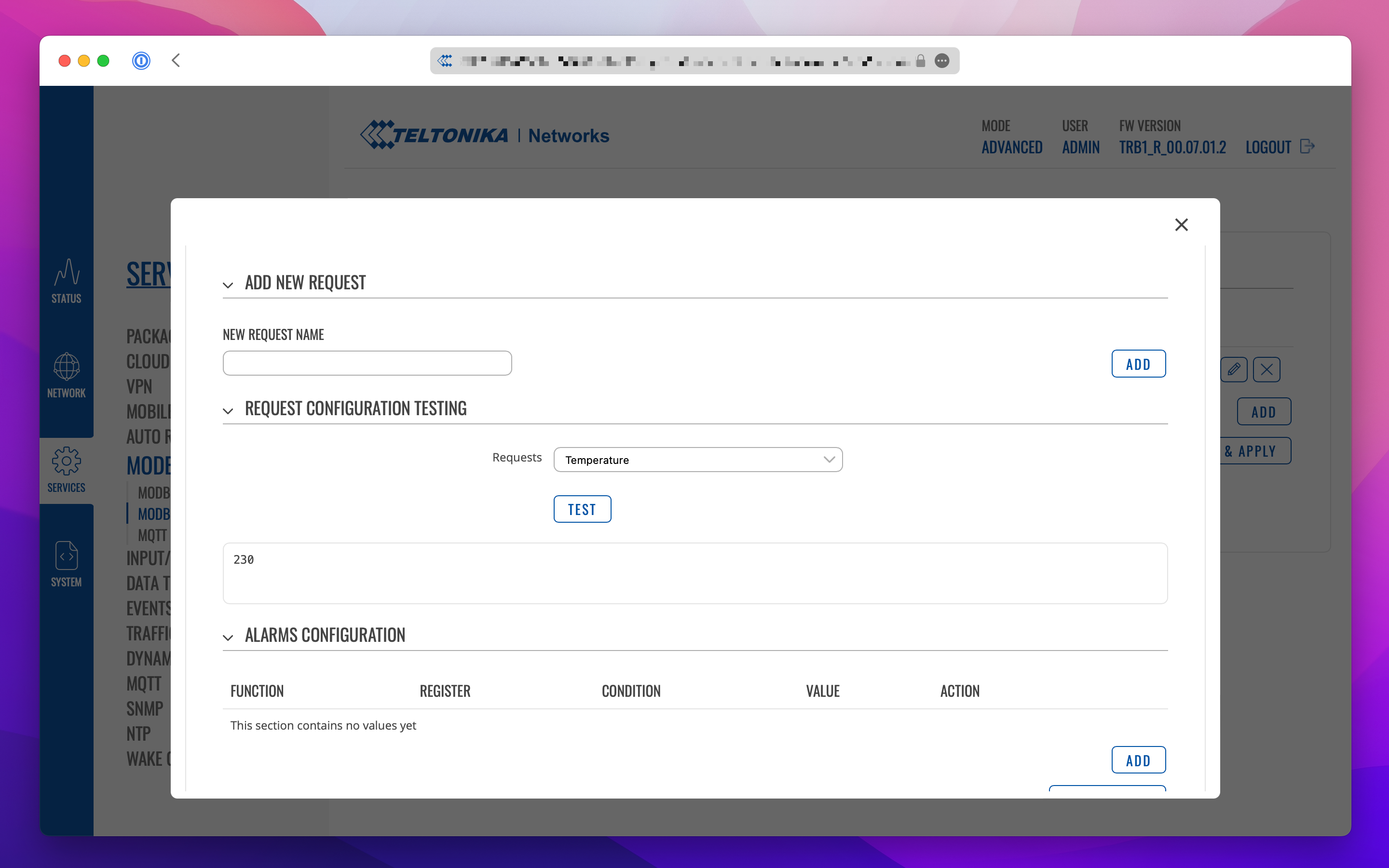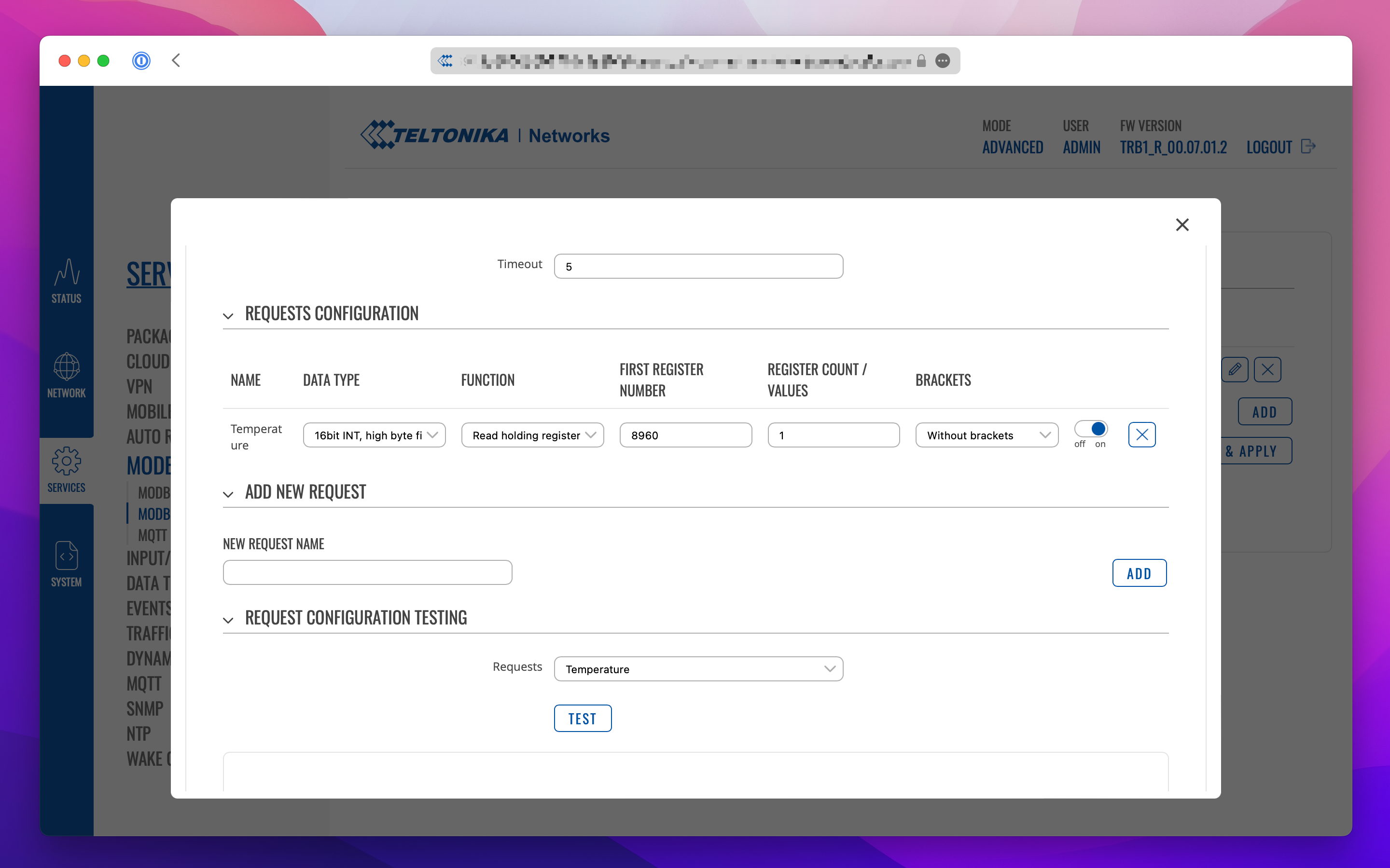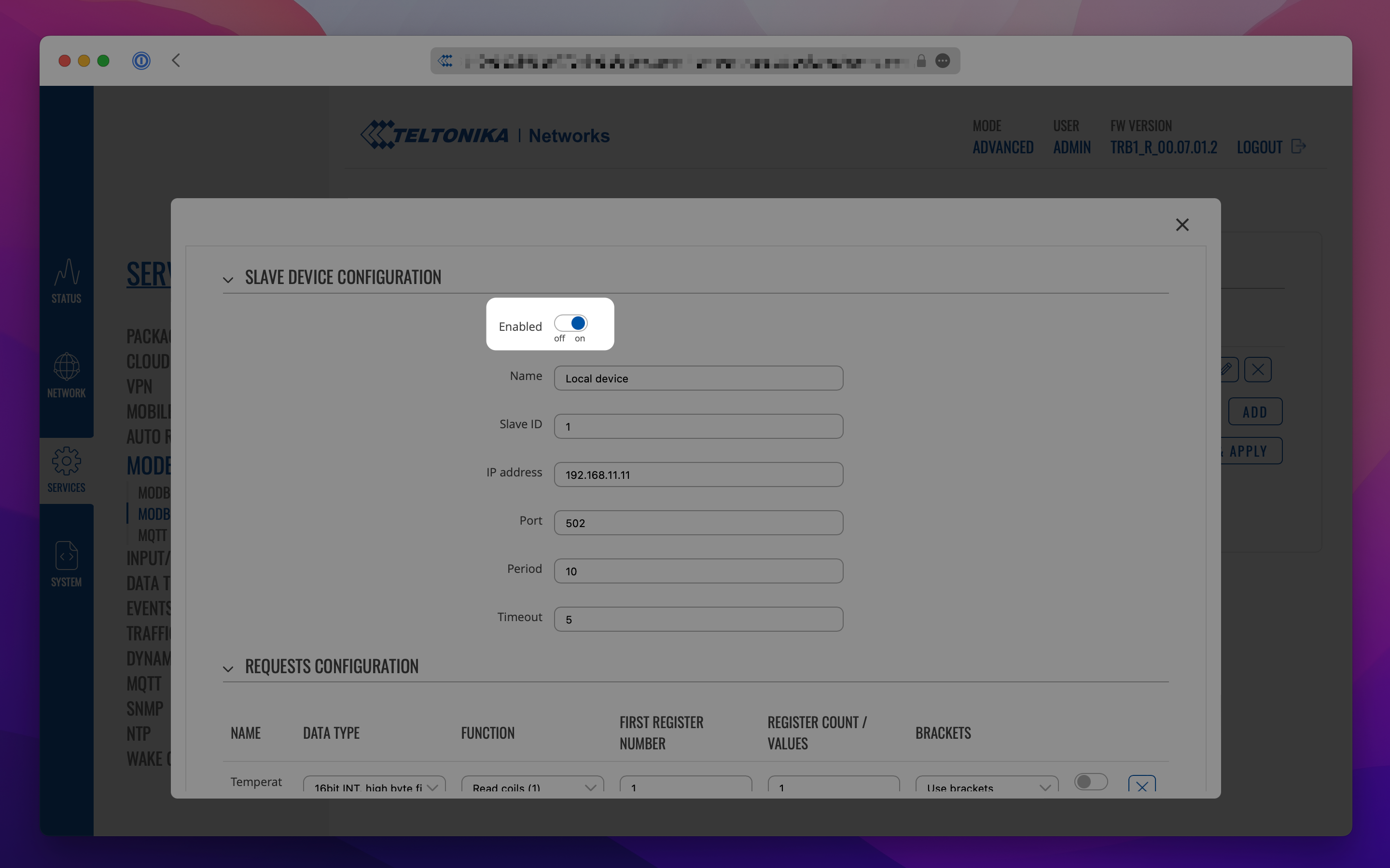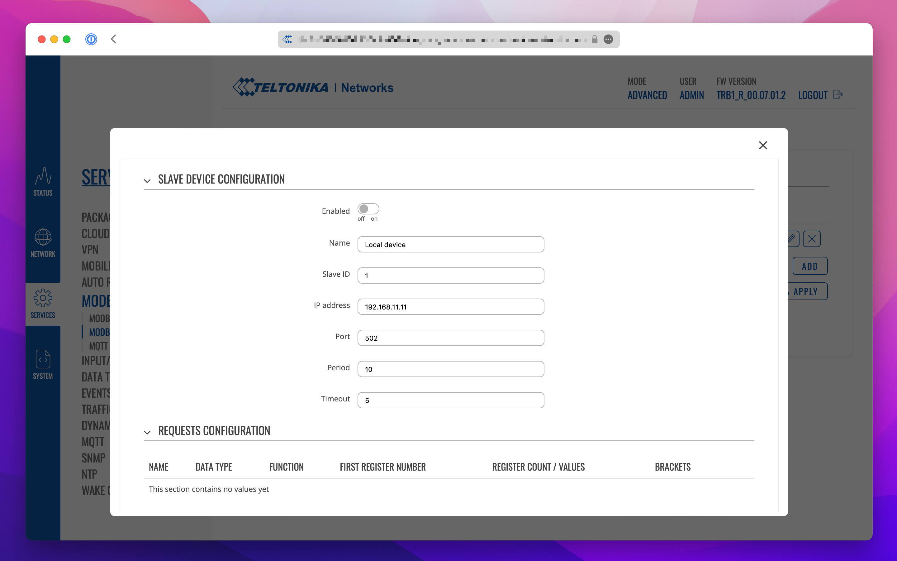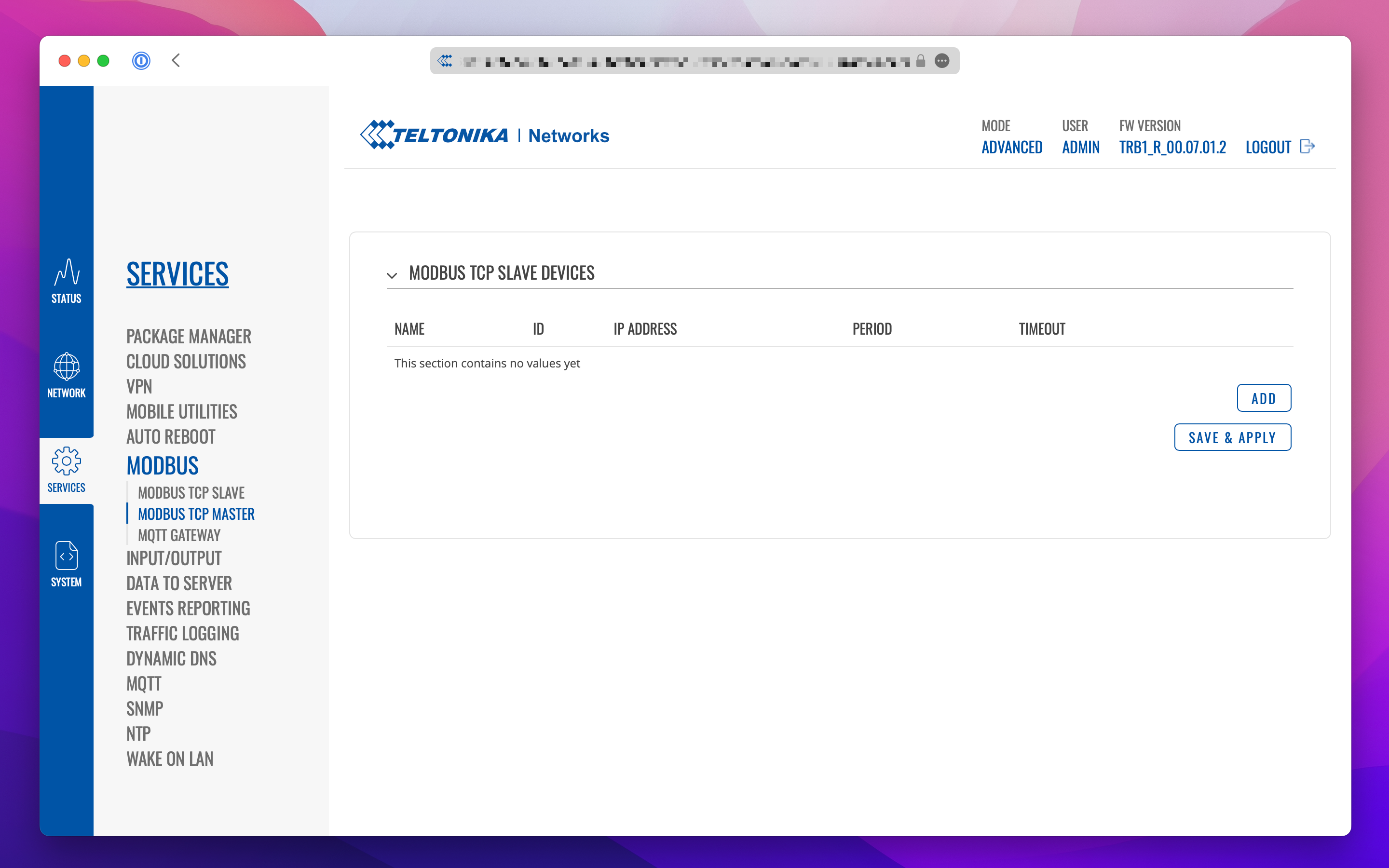 To read data from Modbus, we will use the Teltonika device as a Modbus TCP Server. From the menu on the left, navigate to Services>Modbus and then choose the Modbus TCP Master.