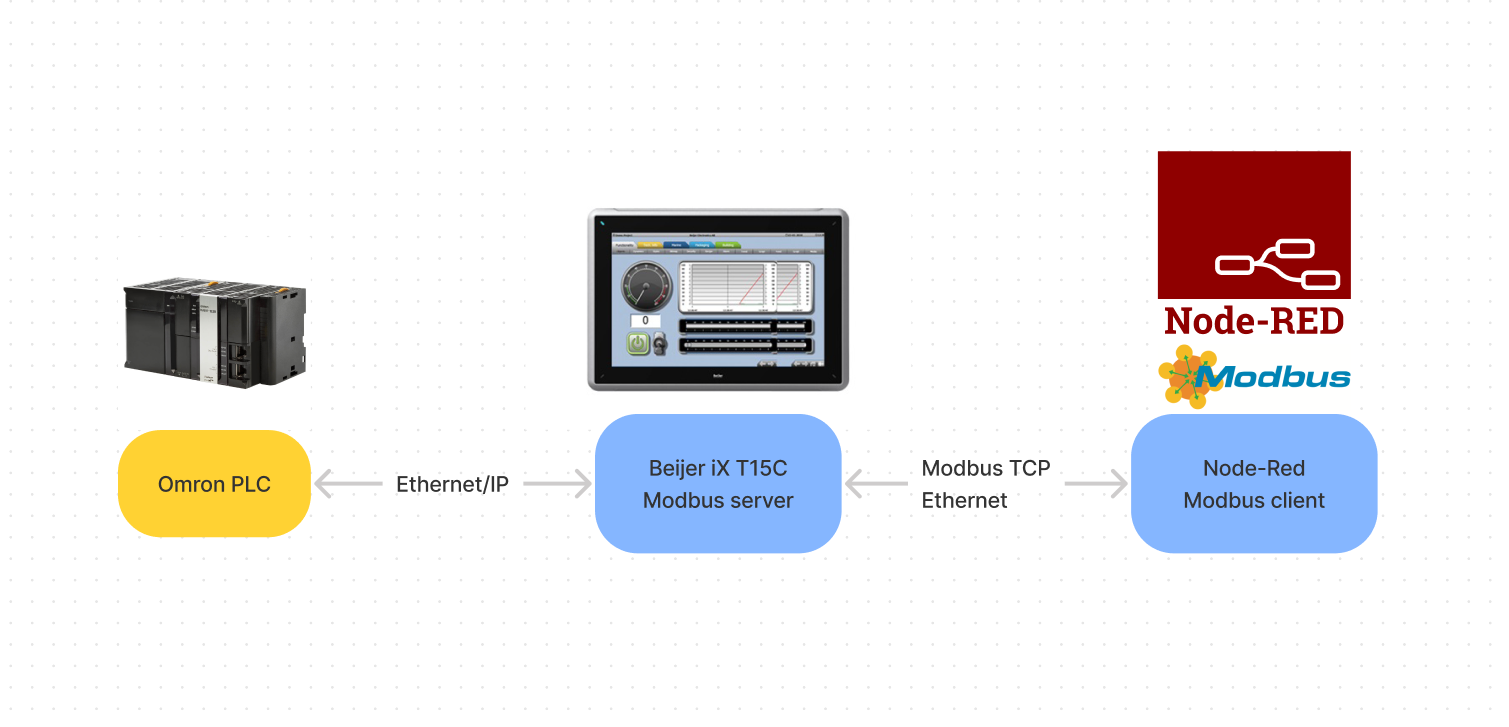 In our office, we have a demo wall with different components used in industrial control systems. For this guide, we have connected an Omron NJ501 PLC to a Beijer HMI over Ethernet/IP. The PLC is programmed to expose random values on different tags that are read and displayed on the HMI. Since the Beijer HMI includes a programmable IX Runtime it lets us enable and expose the values via a Modbus server.
