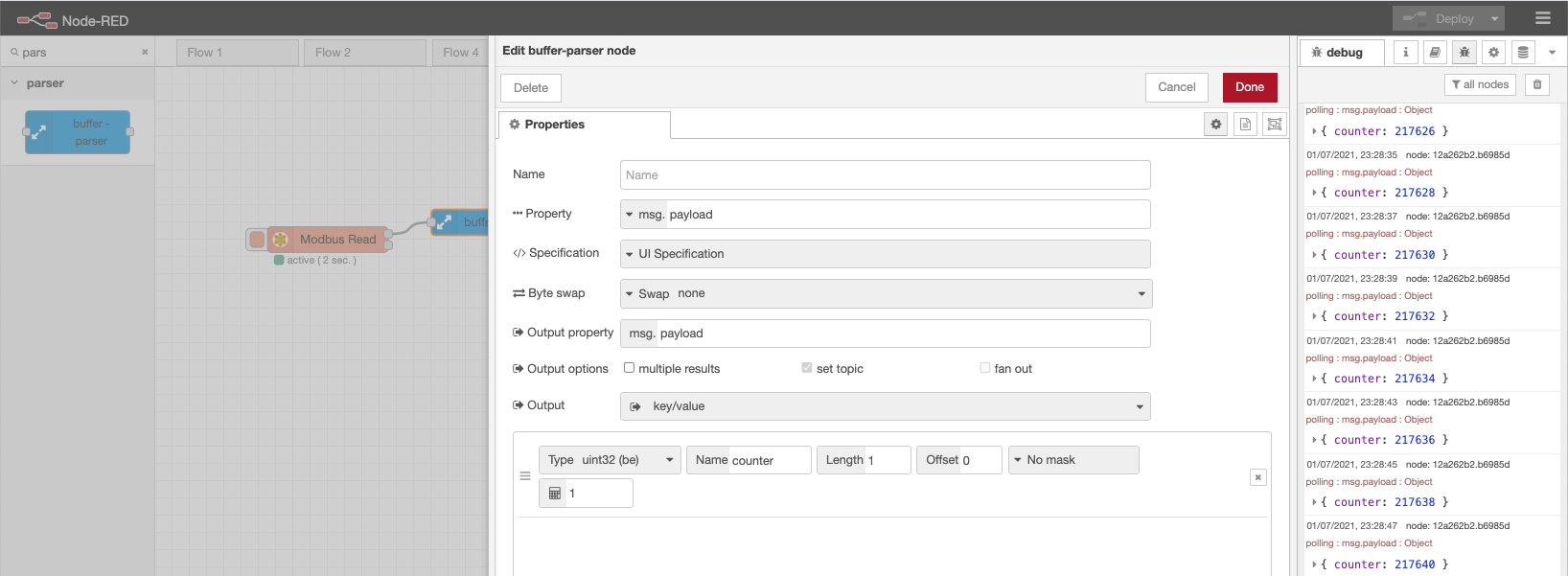 The next thing to do is to drag in a buffer-parser node that will combine the two values into a uint32 variable. Since Modbus is a "big-endian" protocol: that is, the more significant byte of a 16-bit value is sent before the less significant byte we choose type uint32 (be), give the variable the name counter and deploy a new version.