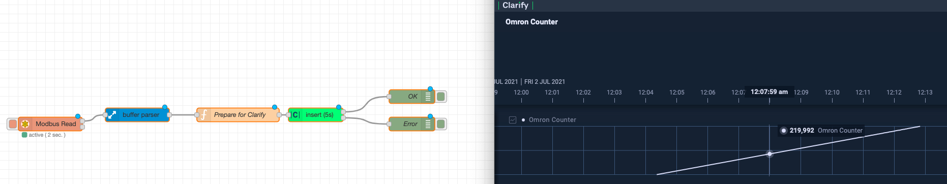 With a polling rate of 2 seconds, we see the number increment by two since the PLC updates the counter every second. To get every count we would need to lower the polling frequency and add a node to filter the result to avoid logging duplicate values, more on that later.
