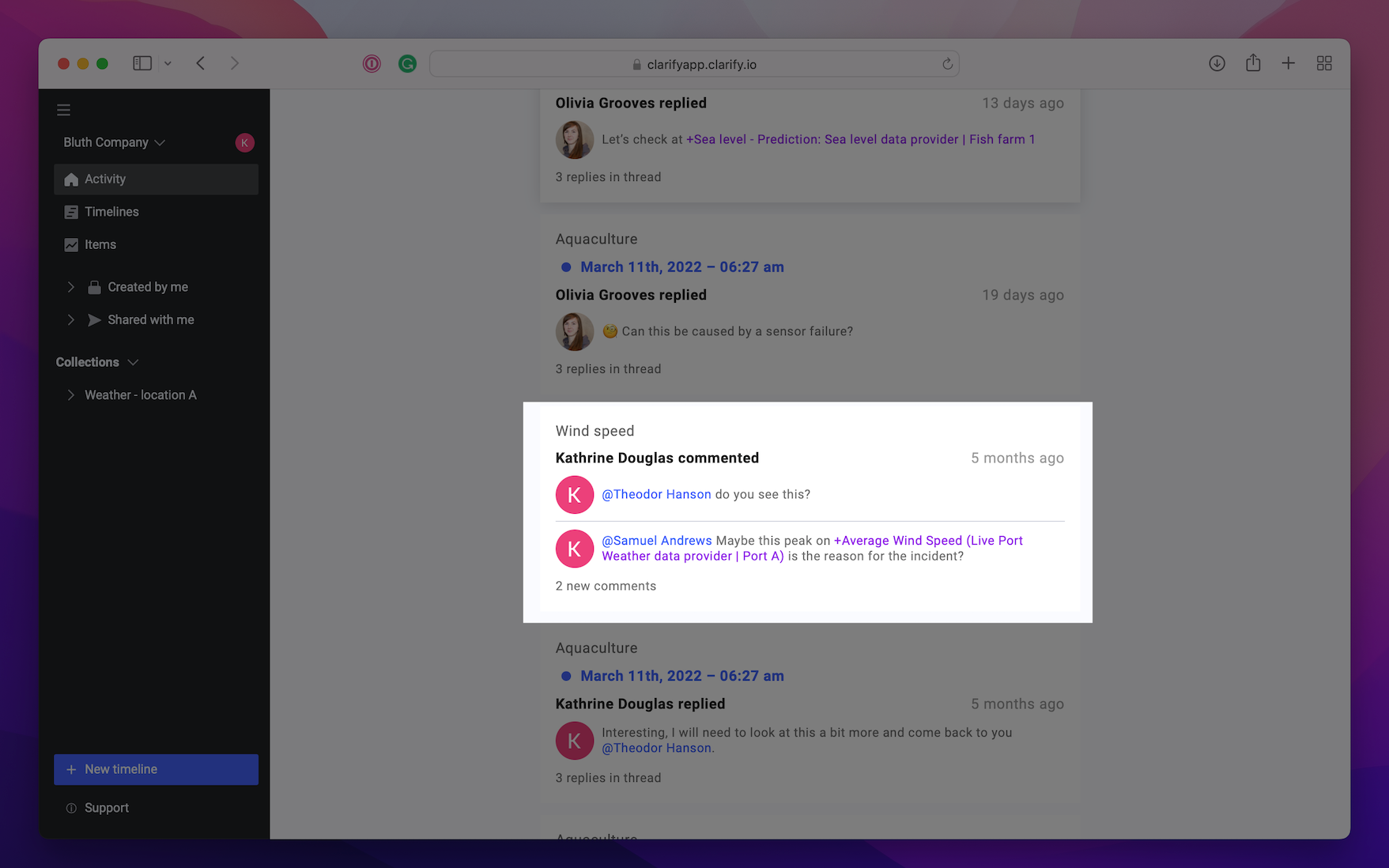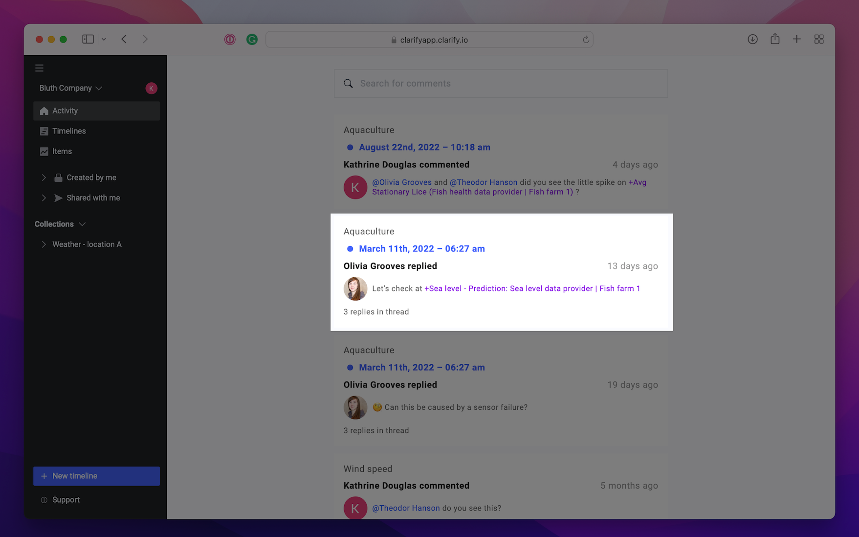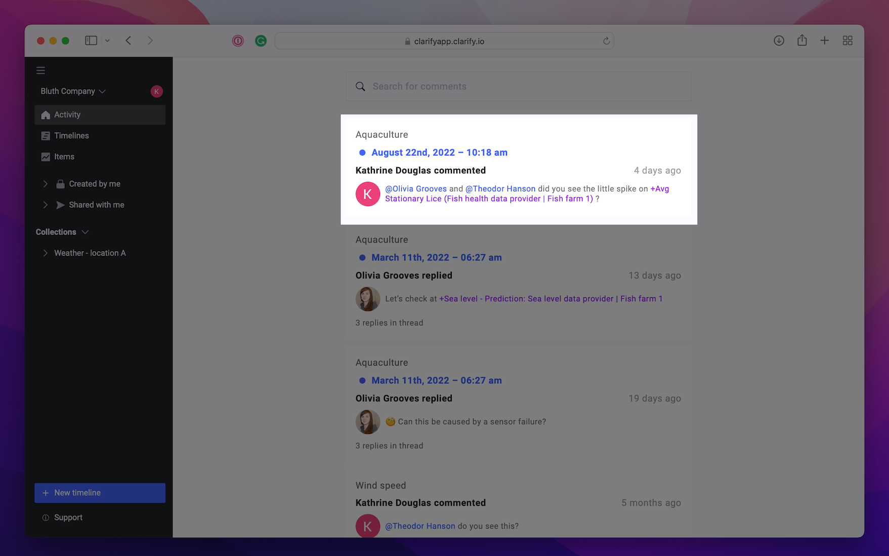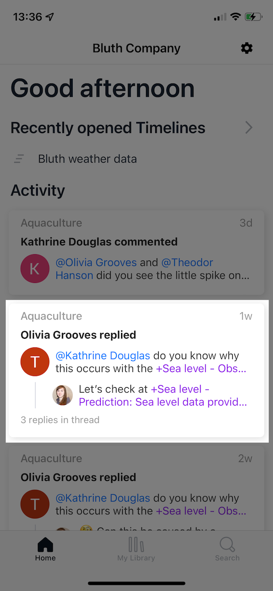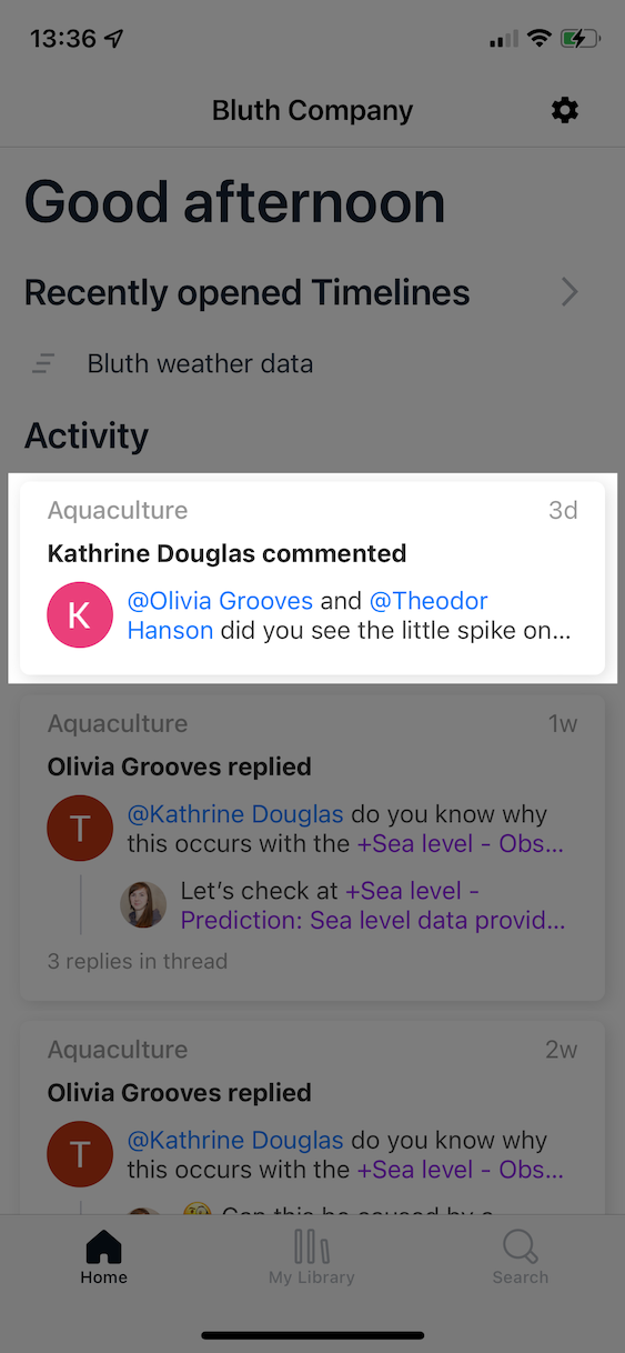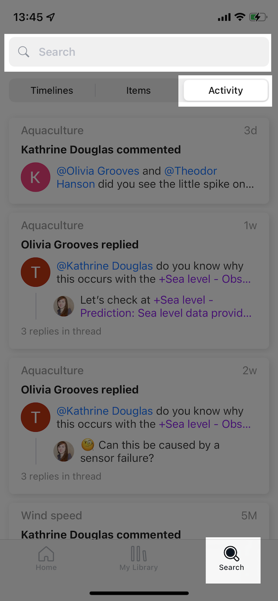 The activity feed gives you an overview of the comments that's being made across all the timelines you have access to. You will find the feed on your home-screen and in "Search" and then select activity. Both new comments and replies to existing ones will show up here, along with any images or file attachments. You can see when and where the comment was made, and if you click any activity you will be taken to the comment inside the timeline where it was made.