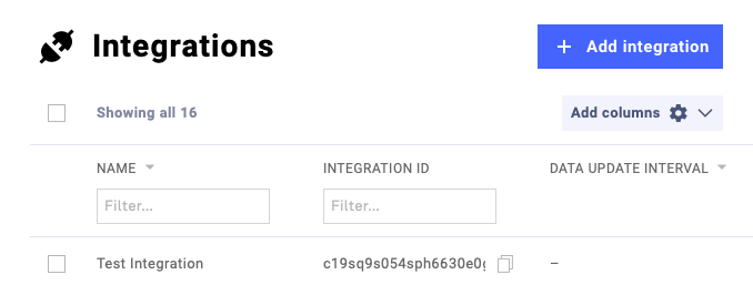 Integrations are created in the Admin panel in the Clarify Web Application, by clicking the button + Add integration and providing a name and an optional description.