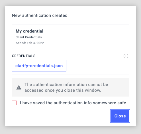 Once the credential is generated, make sure you store them somewhere safe as you won't be able to access them once the window is closed. If you lose your credentials, you can always generate new ones from this panel. It is also possible to have multiple credentials for a single integration.