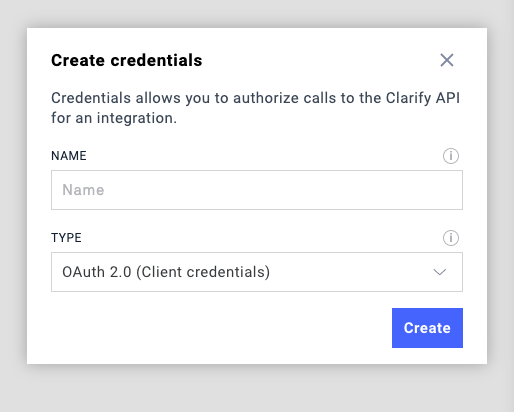 In order to access the Clarify APIs you need to generate credentials, and in order to do so you will need to create an integration. Integrations are the first layer of organizing your data, signals are created by integrations and belongs to the integration that created them. It's common in Clarify to use individual integrations to separate data coming from different sources.