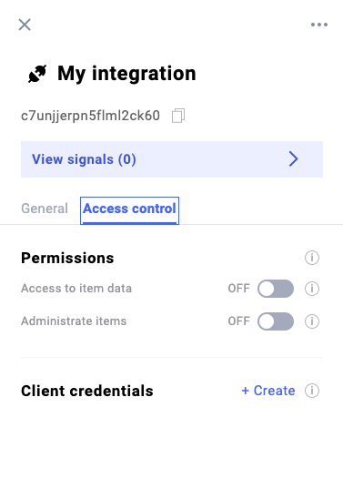 To create new credentials for an integration, click on the integration in the list, select the "Access control" tab and click the "+Create" button next to "Client credentials".