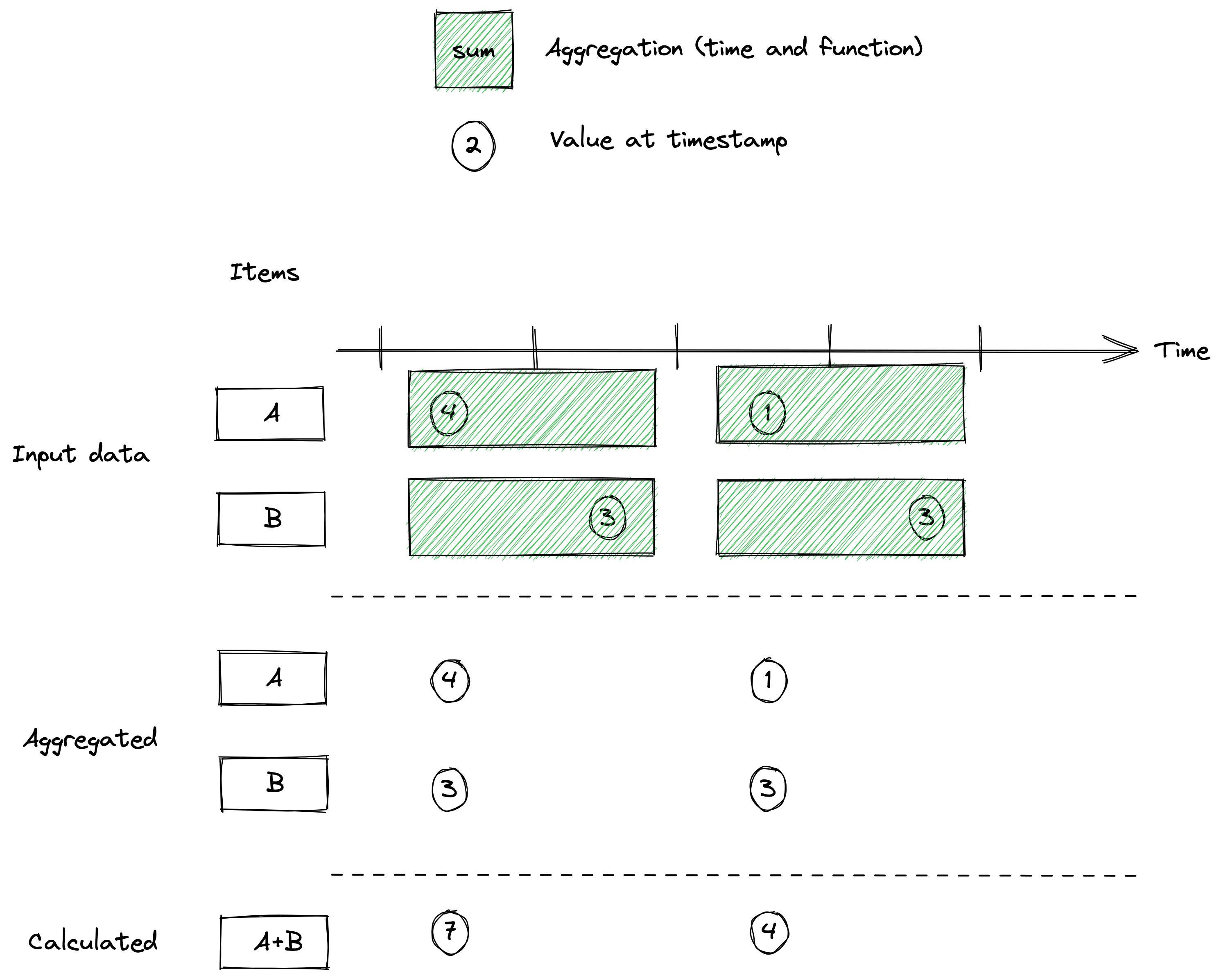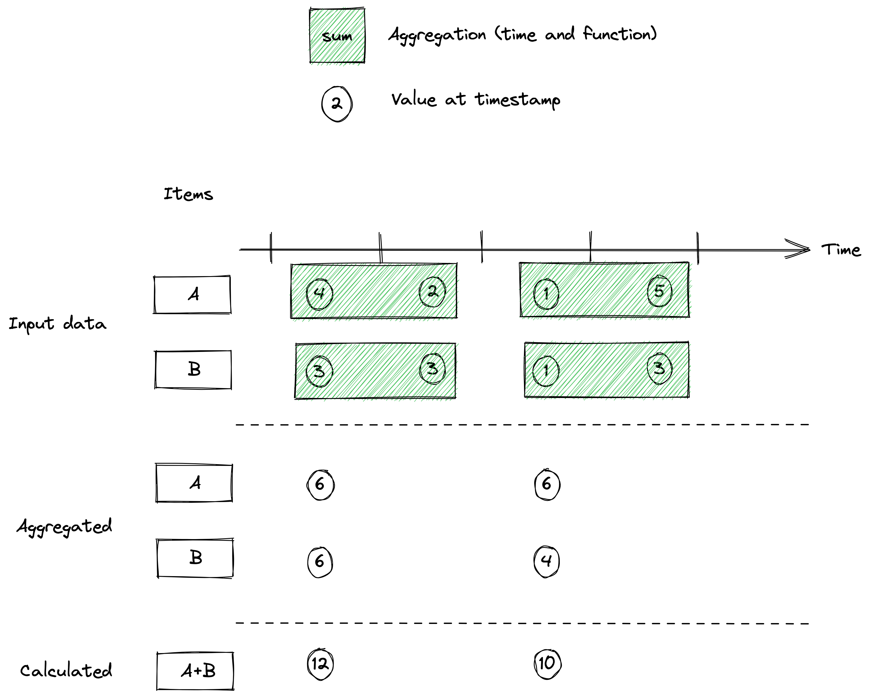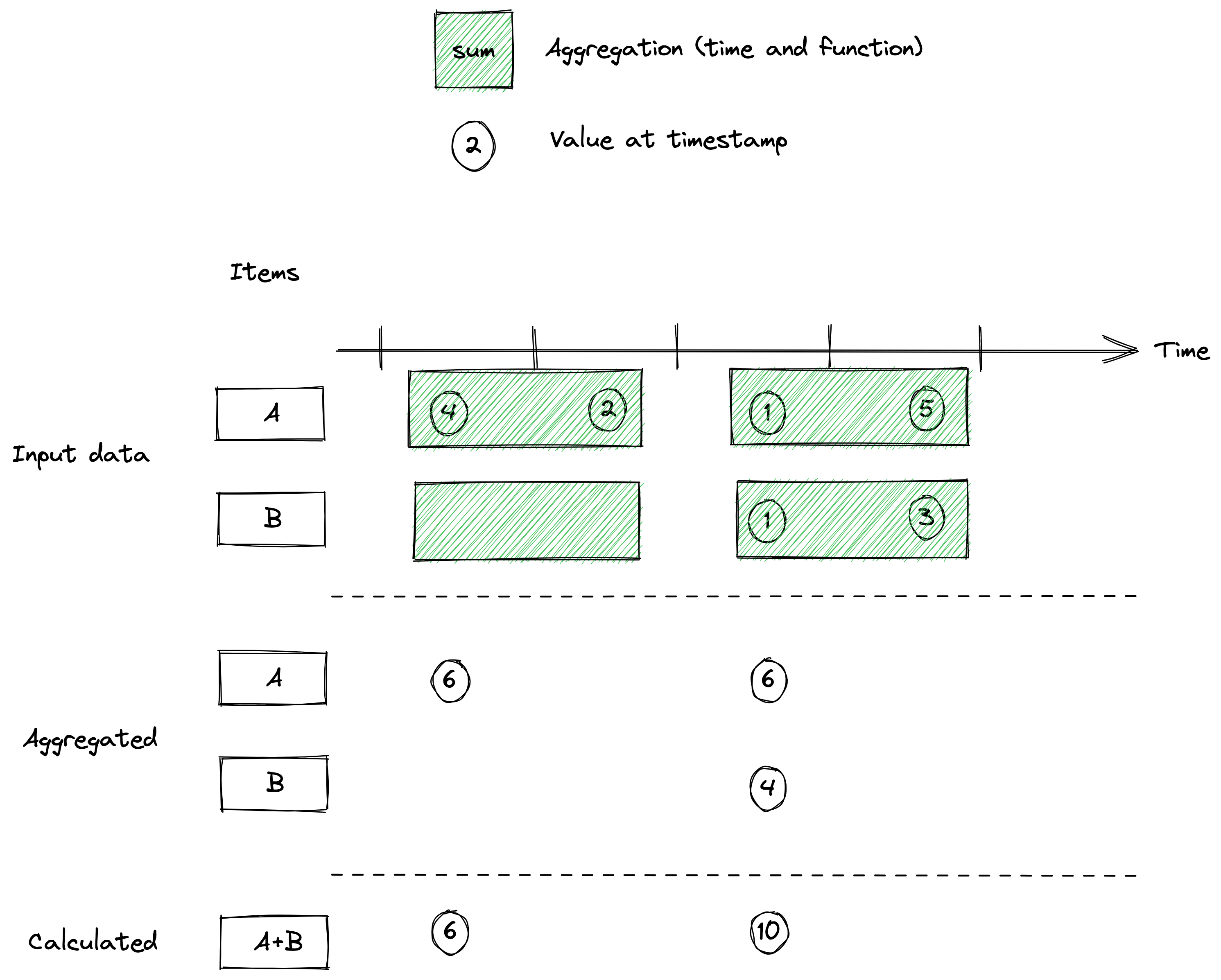 The aggregation for a calculated item is applied to all the variables, and is defined by a time period, and an aggregation method. Examples of this could be sum(1 hour) or `average(15 minute).