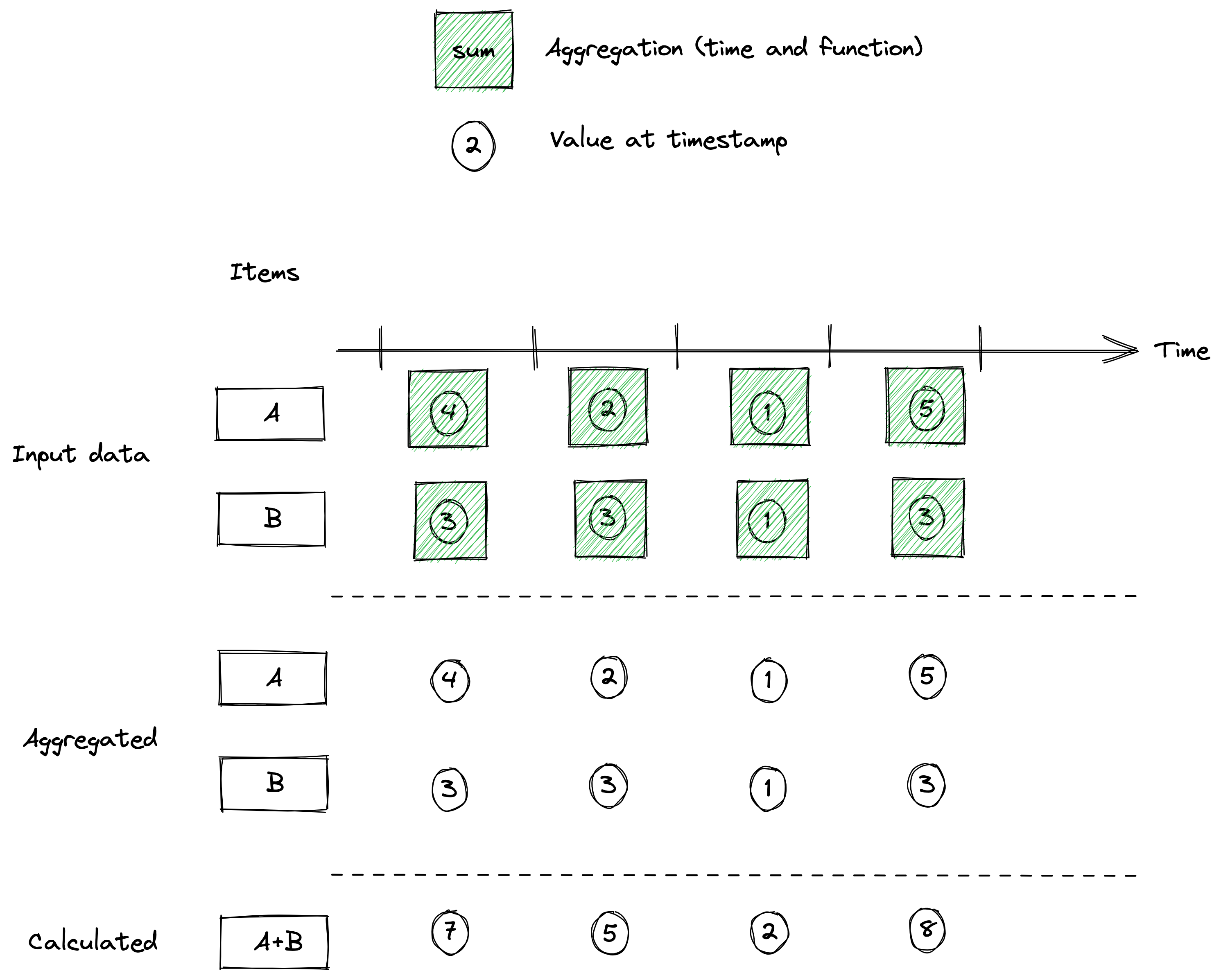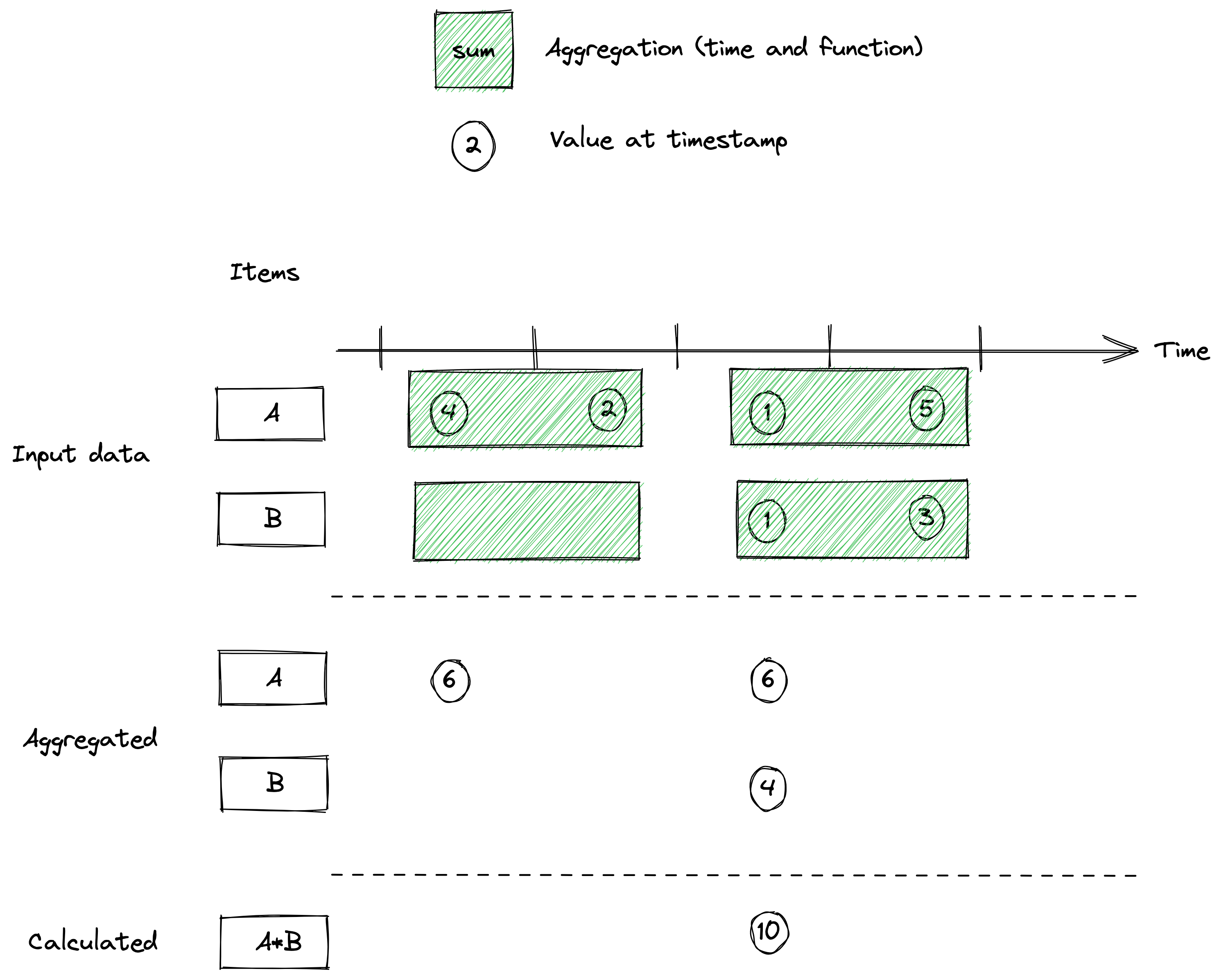 Calculated items take a set of variables, applies an aggregation to each of the input variables to align them in time and finally applies a formula that returns a single value for each timestamp. If we break this down, we can start defining what a calculated item will look like.