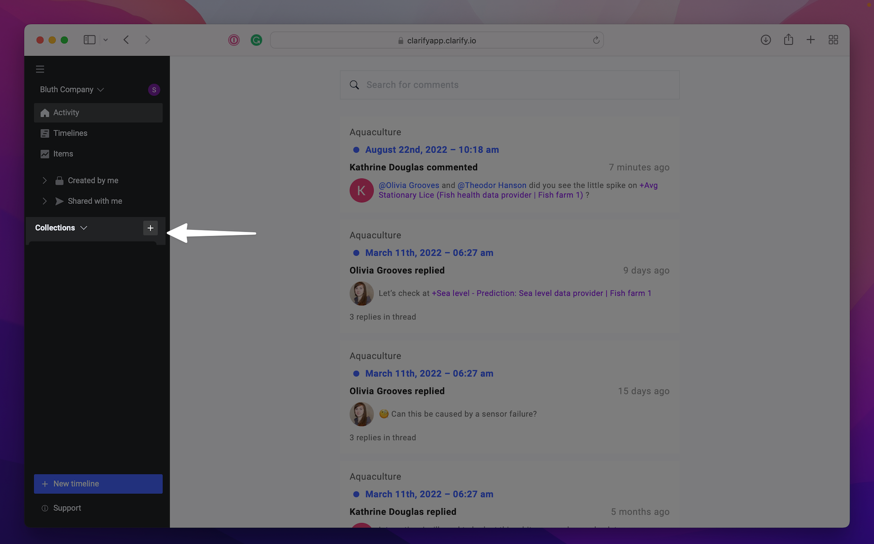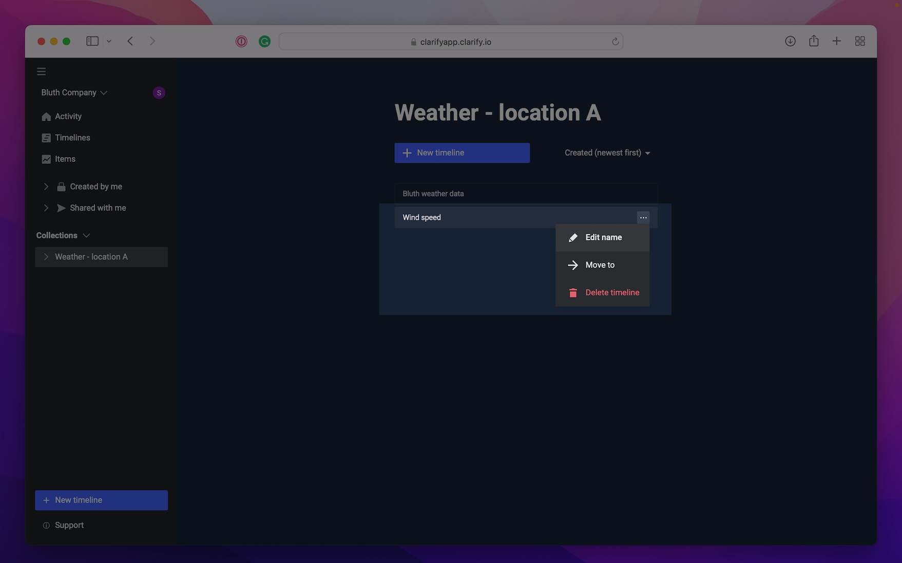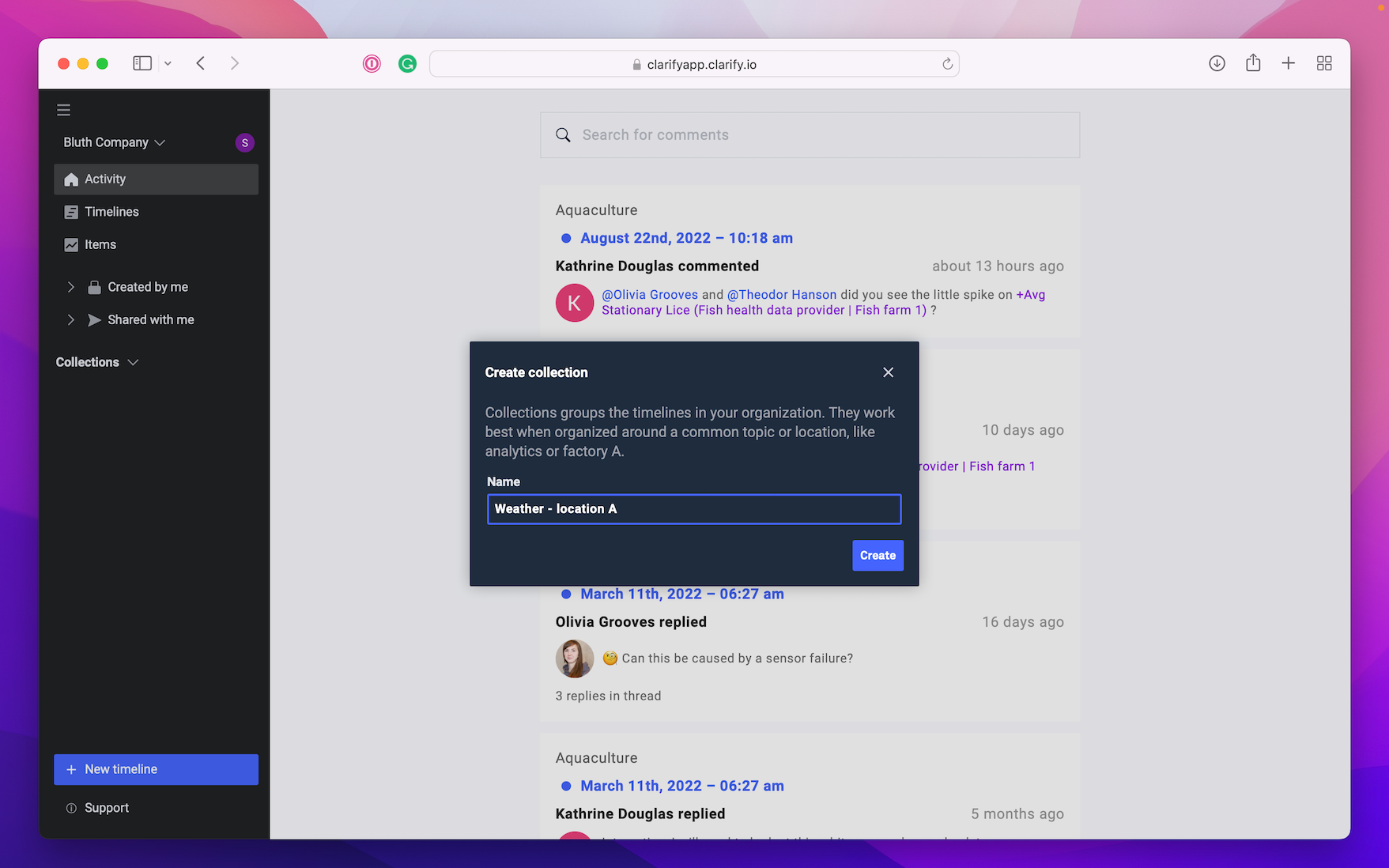 To easily arrange timelines they are automatically sorted in two different categories; "Created by me" and "Shared by me". In addition you can create collections available throughout the organization where you can group timelines relevant to each other. We would recommend organizing the timelines around a common topic or location. Creating collections is only available in the web-app.