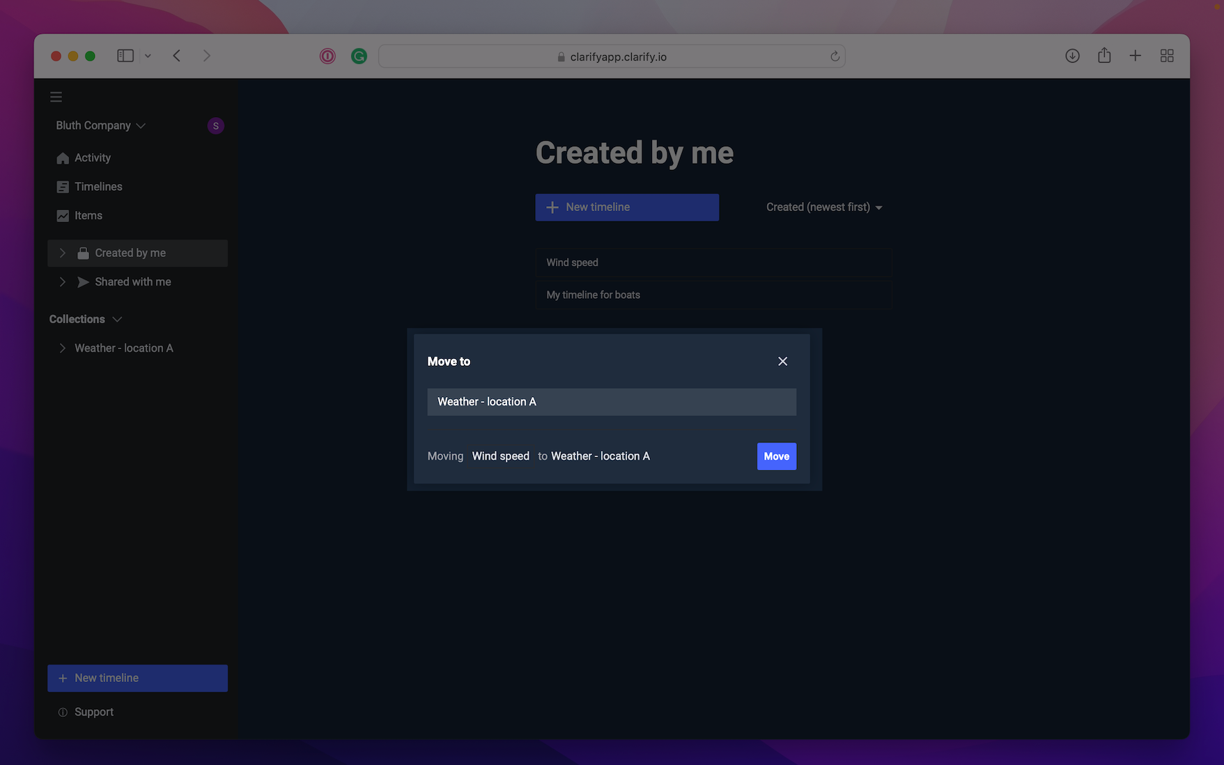 Adding timelines to collections is done by finding the timelines you wish to move, press the three dots next to it and select "Move to". Then select the collection you wish to move it to.