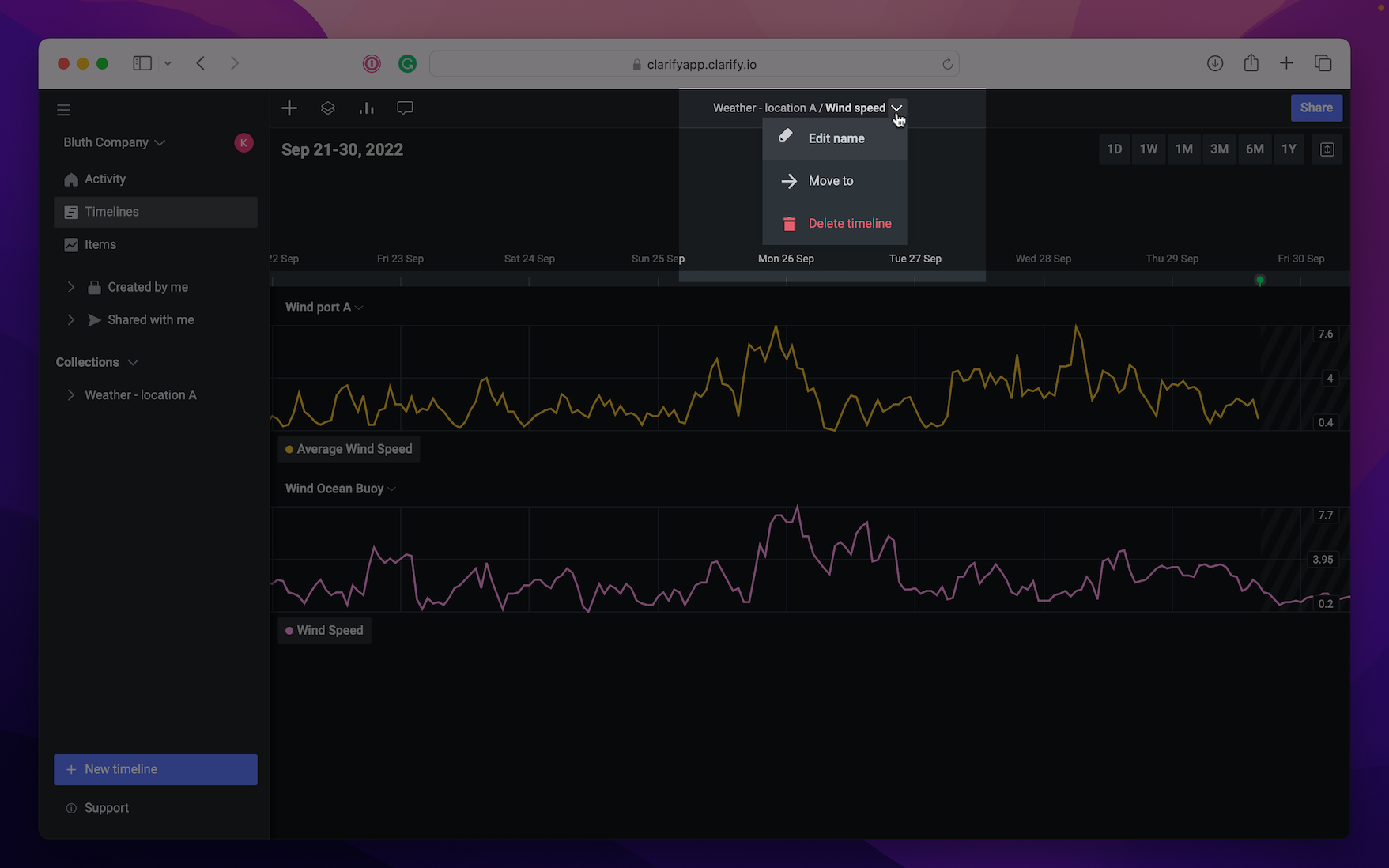 To change the name of the timeline simply click the name of the timeline and type the new name. If you press the arrow next to the name you get the option of editing the name, move the timeline to a collection or delete the timeline.