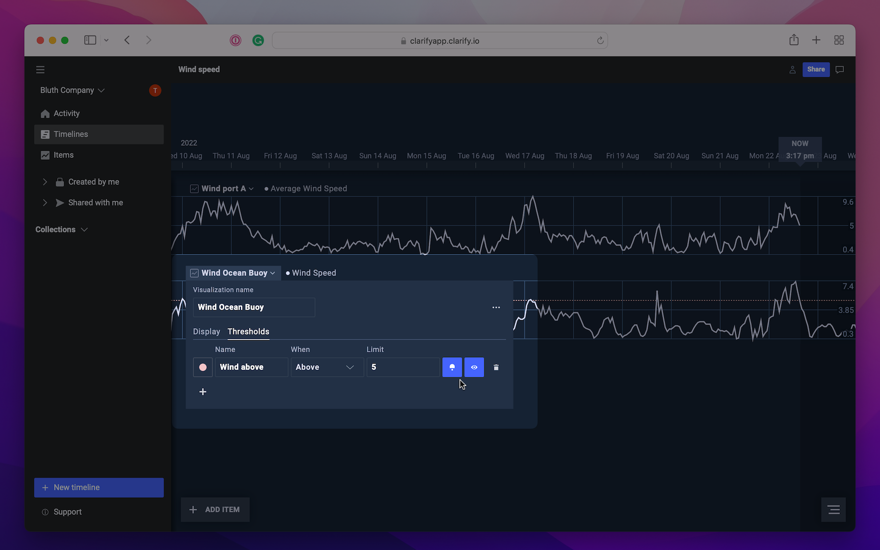To create a threshold you need to log into the web application. Go to a timeline where you have edit or admin rights and press the visualization name, select the thresholds tab and add your threshold. Select if you want to be notified about breaches by toggling the bell icon.