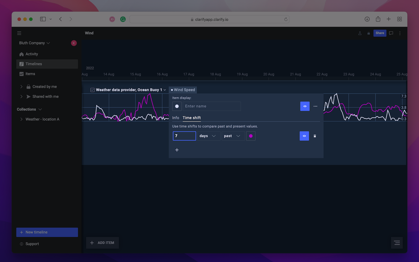 Enter the timeline where the item you wish to shift exist, select the item and press time-shift. Here you can choose the unit (days, hours, minutes or seconds), the value and if you want to shift it into the future or back to the past. Select a color for the shifted item. If you wish to hide it at any point press the "eye" button on the right. Don't need it anymore? Delete the time-shifted graph by pressing the "garbage" button to the right.
